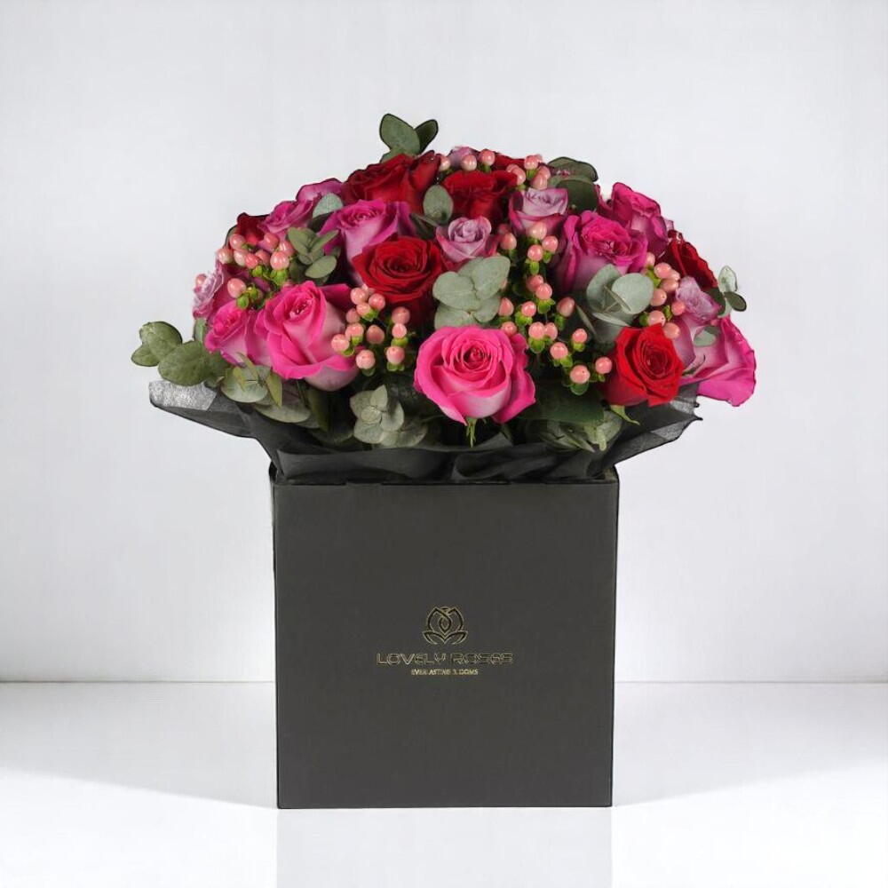 Представляем букет Vibrant Romance Rose Bouquet — потрясающее сочетание насыщенно‑красных, розовых и лавандовых роз, передающих сущность страсти и изящества. Размещённая в изысканной чёрной коробке, эта композиция полна жизни, сочетая пышные розы с мягкой зеленью эвкалипта и деликатными ягодами для естественного, свежего акцента. Разнообразие оттенков розового и красного делает её идеальным выбором для романтических случаев, таких как годовщины, День святого Валентина, или как душевный сюрприз для кого‑то особенного. Каждая роза тщательно отобрана за свою красоту и свежесть, обеспечивая длительное и незабываемое впечатление. Классическая элегантность дизайна дополнена стильной чёрной коробкой, придающей современный штрих вечной красоте роз. Пусть эта великолепная композиция украсит любое помещение и наполнит воздух любовью и радостью. Свежие розы аккуратно завернуты в тонкую бумагу и упакованы в сумку. Розы получены в Эквадоре с соблюдением этических норм. Доступны в широком ассортименте цветов.
