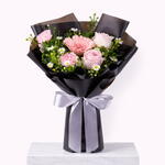 Smoky pink roses with pink Gerbera— moody and sophisticated . Pink Rose 2 Stems, Pink Carnation 2 Stems, Pink Gerbera 1 Stem, White Daisy 2 Stems