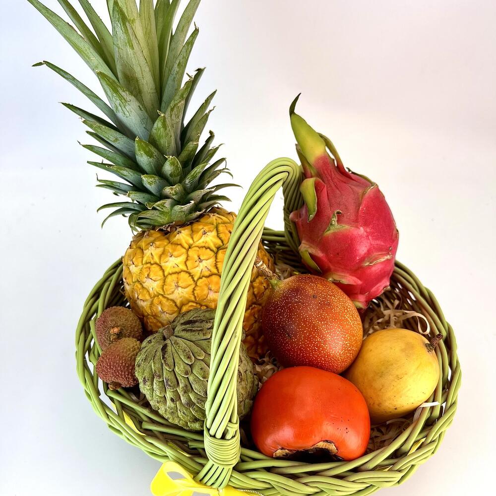 Basket - 1 шт. pineapple - 1 шт. mango - 2 шт. persimmon - 1 шт. dragon fruit - 1 шт. grenadine - 2 шт. graviola - 1 шт. wood shavings - 1 шт. lychee 100gr - 1 шт.