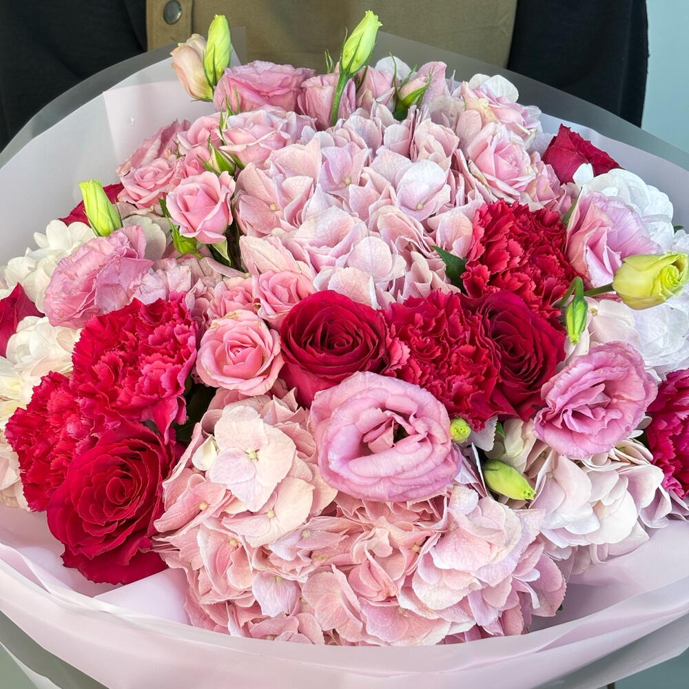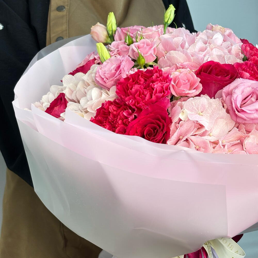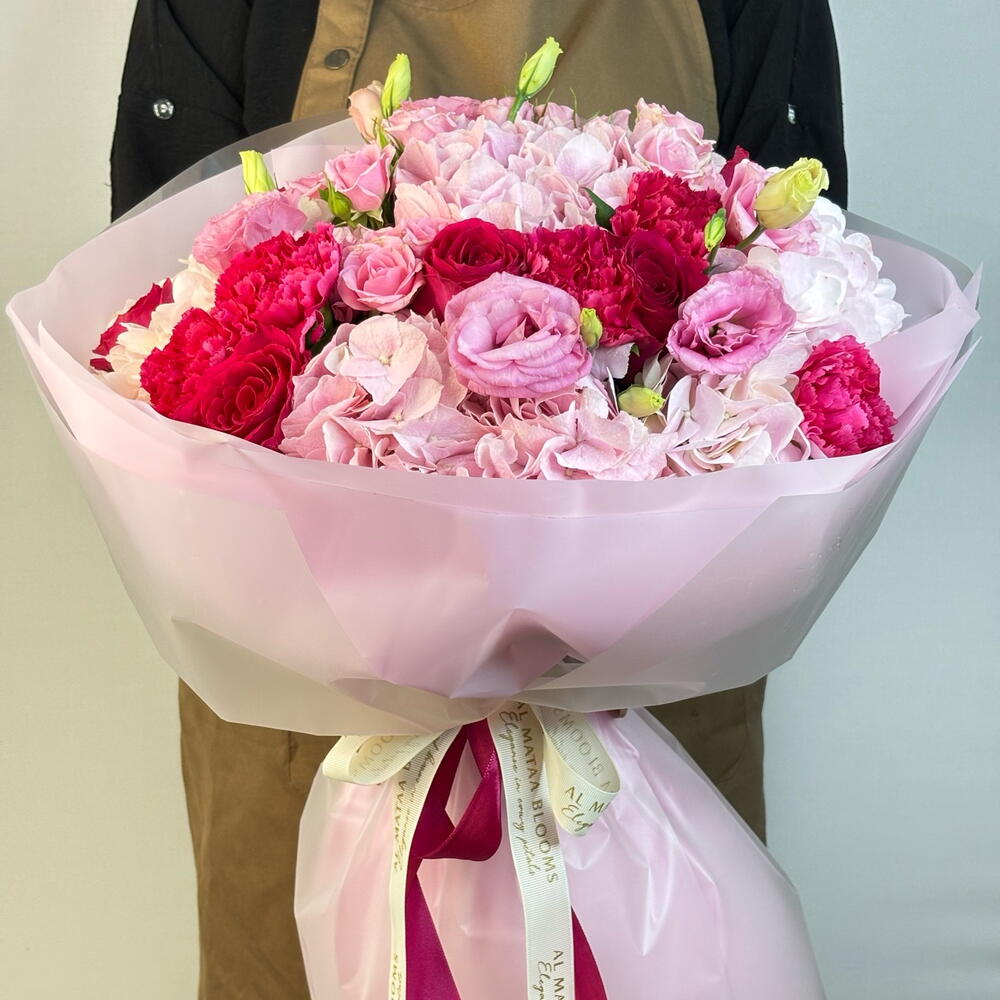 lisianthus pink - 4 шт. spray rose pink - 6 шт. eucalyptus leaves - 5 шт. фуксиево-розовая роза - 7 шт. гвоздика фуксия - 6 шт. премиальная розовая гортензия - 6 шт.
