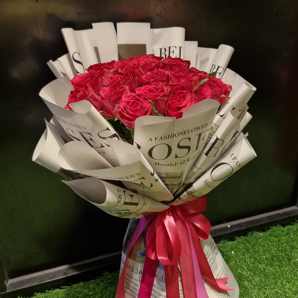 Роза фуксия в газетной обёртке