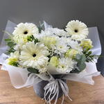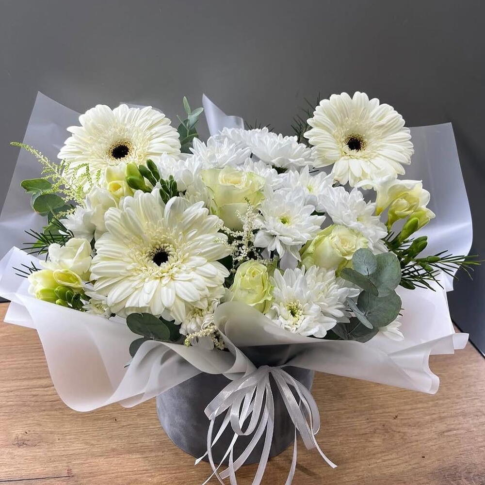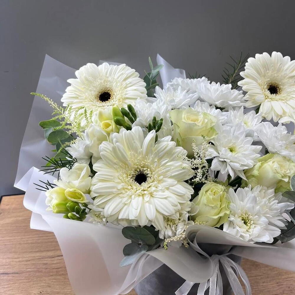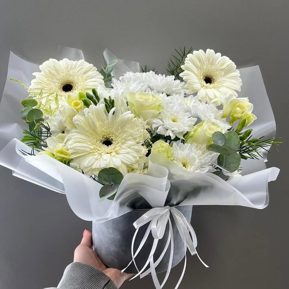хризантема - 3 шт. эукалей - 3 шт. roses - 7 шт. гарбара - 3 шт. в горшке - 1 шт.