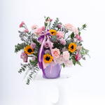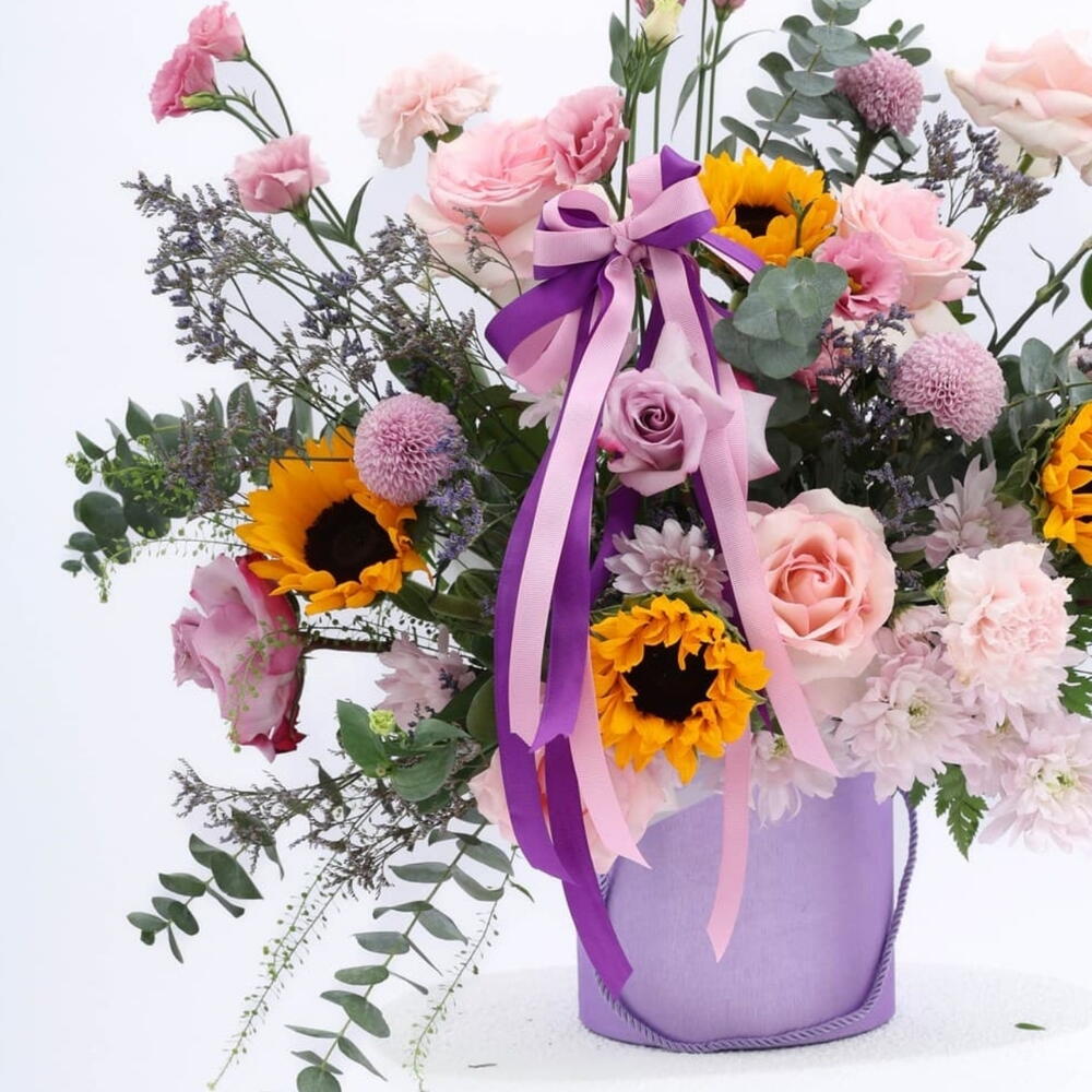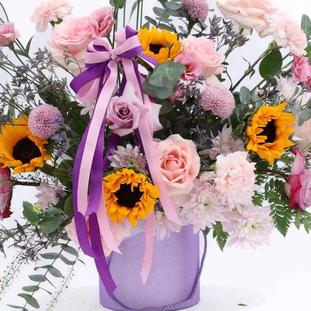 Eucalyptus - 3 шт. Sunflower - 4 шт. rose pink - 4 шт. carnation pink - 3 шт. glass vase - 1 шт. rose purple - 3 шт. lisianthus pink - 5 шт. липидиум - 3 шт. стебель кожистого папоротника - 4 шт. пинг-понг - 3 шт. розовая кустовая гвоздика - 3 шт. фиолетовая хризантема - 2 шт.
