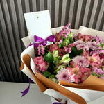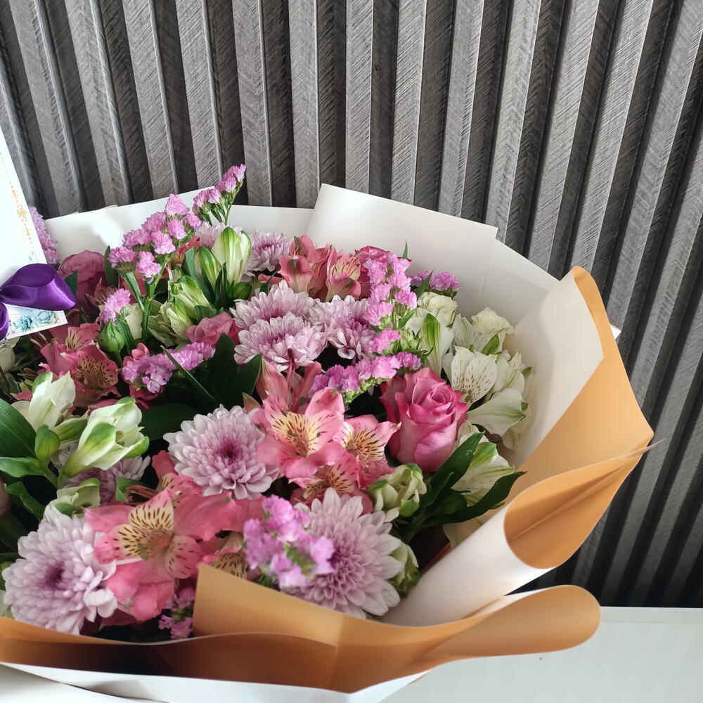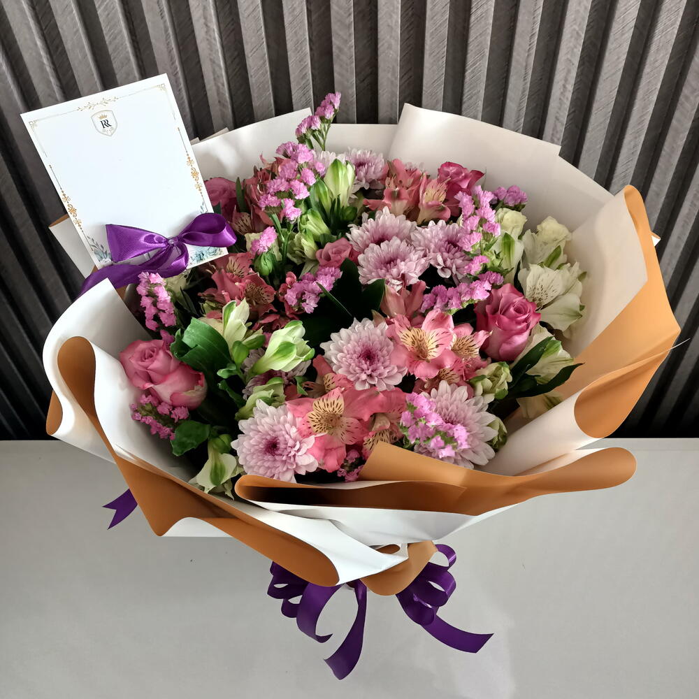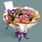 Наслаждайтесь очарованием нашего букета «Парад пастельных лепестков». Это красивое оформление представляет собой восхитительное сочетание цветов пастельных оттенков, аккуратно связанное вручную и завернутое в элегантную бумагу с яркой фиолетовой лентой.