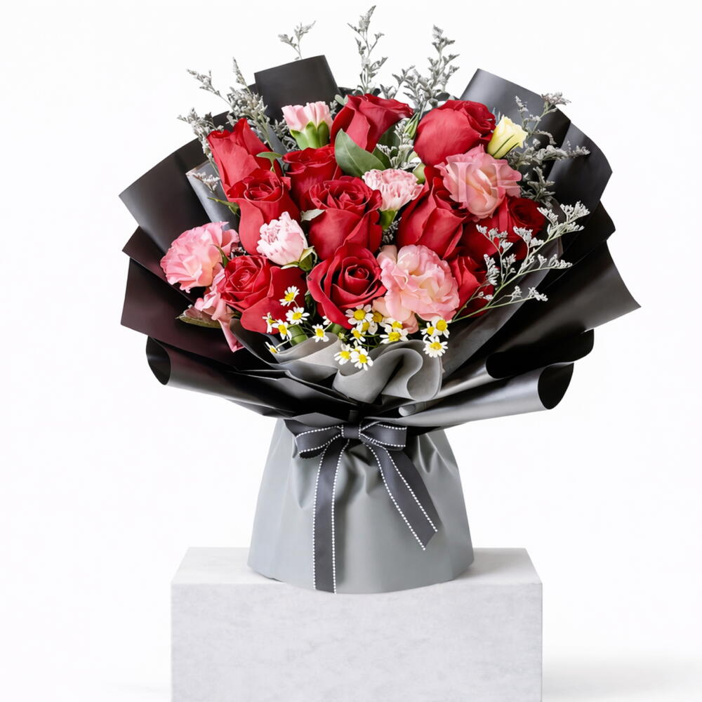 Розовые и винно-красные розы с кружевной лентой — ностальгические и романтичные. Красная роза 12 стеблей, Розовая гвоздика 5 стеблей, Розовая эустома 2 стебля, Розовый лимониум 1 стебель, Ромашка 1 стебель