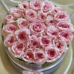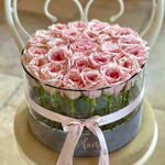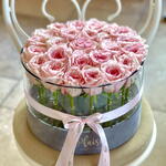 Акриловая коробка — вершина цветочного кутюра. Изготовлена вручную с использованием нагрева, коробка полностью многоразовая. Роскошная круглая акриловая коробка Plaisir вмещает 25 красивых свежих роз нежно-розового цвета, уютно расположенных среди уникальных камней в воде и украшенных шелковыми бархатными лентами. Это подарок, который не только поразит получателя, но и тонко подчеркнёт ваш изысканный вкус. (размер коробки: 30 см в диаметре)