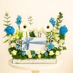 Сияющие синие розы и хризантемы изящно контрастируют с белоснежными герберами и гипсофилой. Оформленная в стильной прозрачной основе с белыми камнями и подчеркнутая воздушной зеленью, эта композиция дарит свежее, современное очарование. Чтобы сохранить ее красоту, ежедневно слегка опрыскивайте цветы и обновляйте флористическую губку чистой водой каждые два дня. Держите композицию вдали от источников тепла и прямых солнечных лучей, чтобы она дольше сохраняла свежесть. Идеальный выбор для особых моментов — дней рождения, годовщин или любого трогательного события, этот цветочный букет выходит за рамки обыденного и становится ощутимым воплощением любви. Отправьте его в подарок на день рождения, передайте поздравления с годовщиной, пожелайте скорейшего выздоровления или просто подарите кому-то дорогому мгновение любви.