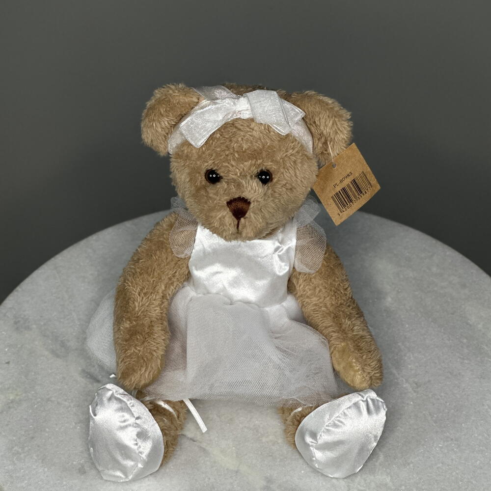 Silken Bride Bear — это вручную сшитый плюшевый медвежонок, одетый в атласное платье цвета слоновой кости с прозрачной кружевной накидкой, крошечными жемчужными пуговицами и миниатюрной фатиновой вуалью — воплощая поэтичную грацию «что-то старое, что-то новое». Ее облачно‑мягкий кремовый мех и мерцающие глазки приглашают к нежным объятиям, а изящный букетик атласных роз завершает ее свадебное очарование.