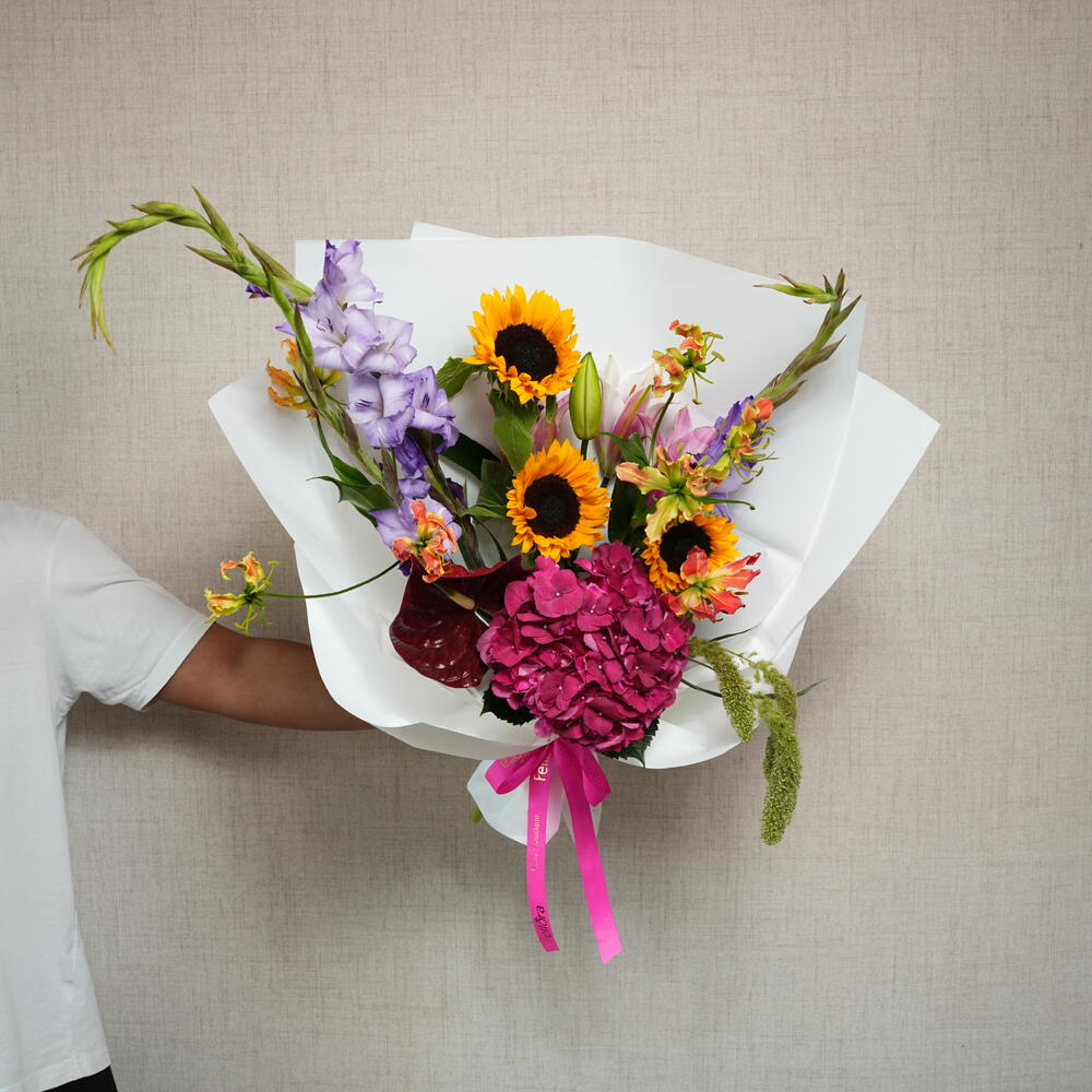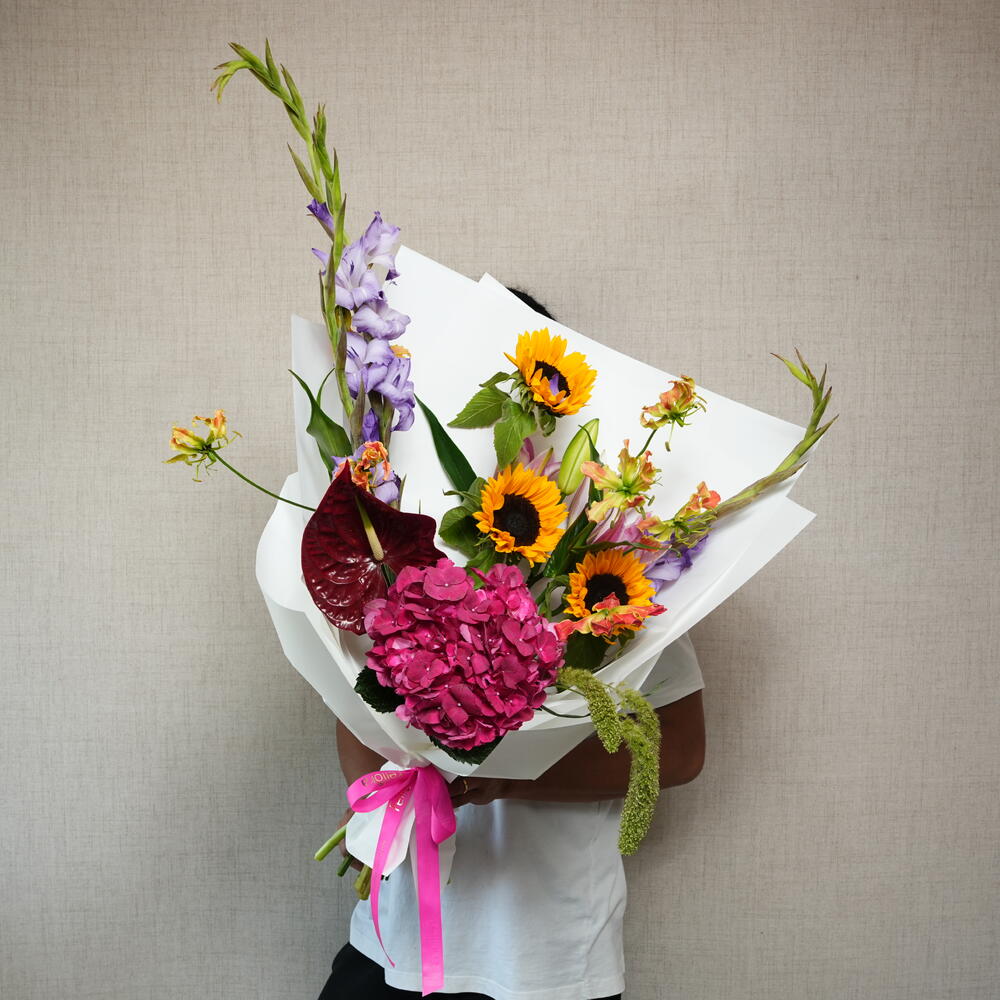 Лучезарная смесь гладиолусов, подсолнухов, гортензий и лилий в шикарной белой упаковке.