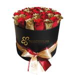 Описание товара: Композиция из 20–25 красных и золотых роз в черной круглой коробке