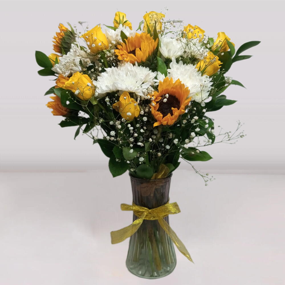 Sunflower - 5 шт. Vase - 1 шт. baby breath - 2 шт. white chrysanthemum - 4 шт. rescus - 4 шт. желтые розы - 10 шт.