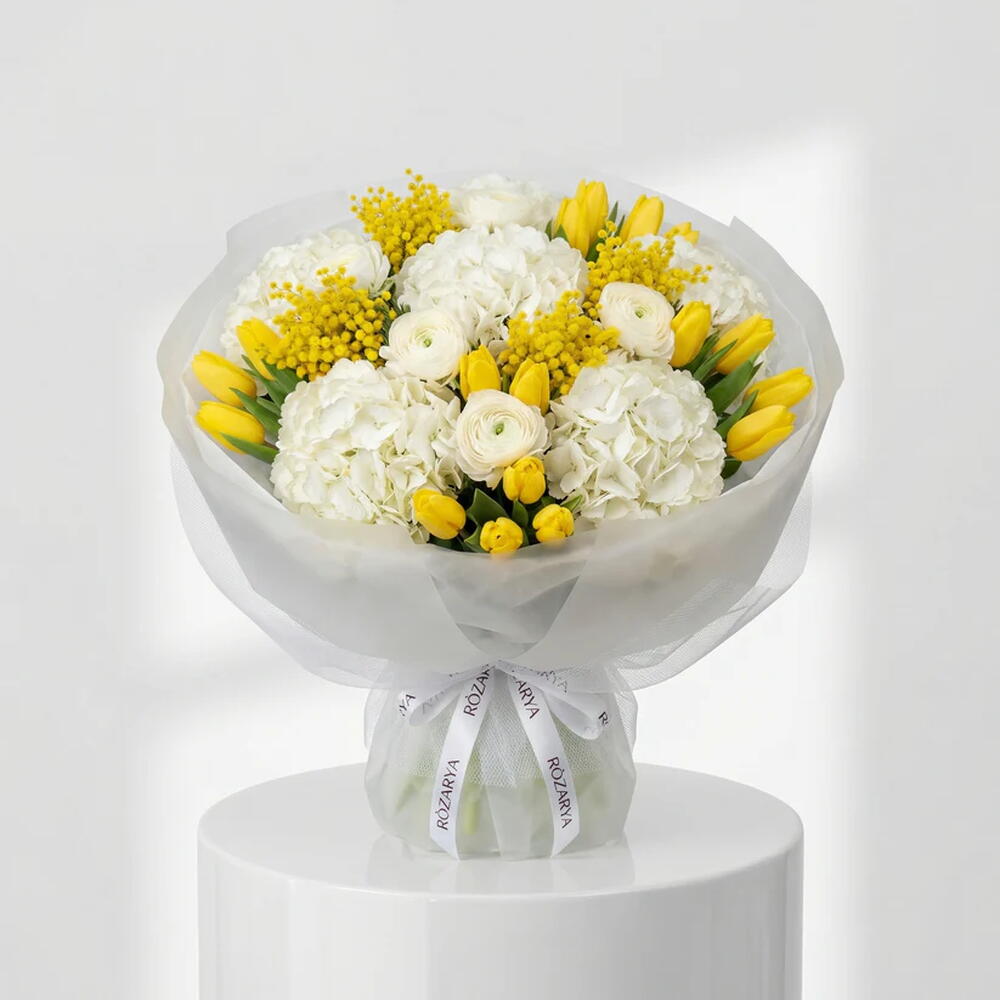 Яркий и освежающий букет, сочетающий солнечно-жёлтые тюльпаны с пышной белой гортензией и нежными ранункулюсами, с нотами мягкой мимозы. Весёлый, но элегантный, этот букет создаёт ощущение чистой весны — идеально подходит для дней рождения, праздников и подарков, поднимающих настроение.