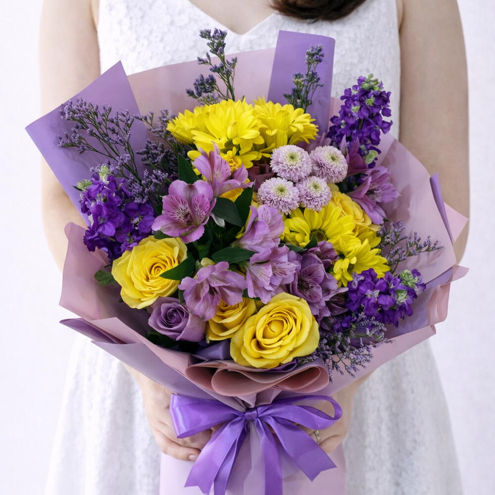 Яркий букет, сочетающий солнечно‑жёлтые цветы с насыщенными фиолетовыми акцентами для смелого, но элегантного образа. Выполнен из премиальных жёлтых роз, золотистых хризантем, фиолетовой альстромерии и сезонных фиолетовых наполнителей, оформлен стильной лиловой обёрткой с подходящей лентой. Идеальный выбор для дней рождения, поздравлений, пожеланий скорейшего выздоровления или чтобы поднять кому‑то настроение. Одиночные розы: 4 шт. Жёлтые: 3 шт. Фиолетовые: 1 шт. Хризантема (жёлтые ромашковидные хризантемы): 3 стебля Помпонная хризантема (светло‑фиолетовая): 2 стебля Альстромерия (фиолетовая): 3 стебля Левкой (фиолетовый): 2 стебля Статице / лимониум (фиолетовый наполнитель): 2 стебля Примечание к покупке: Бесплатная печать поздравительной открытки включена в каждый заказ. (Пожалуйста, напишите сообщение для открытки при оформлении заказа.) Изменение цвета цветов: вы можете запросить изменение цвета цветов в соответствии с вашими предпочтениями. Это зависит от наличия и может варьироваться в зависимости от ежедневных запасов. Дополнительные опции: вы можете добавить дополнительные предметы, такие как: Шары, буквы, цифры, шоколад, духи и подарочные товары (по желанию). Гарантия свежести: мы всегда используем свежие цветы и обеспечиваем максимально возможное качество оформления.