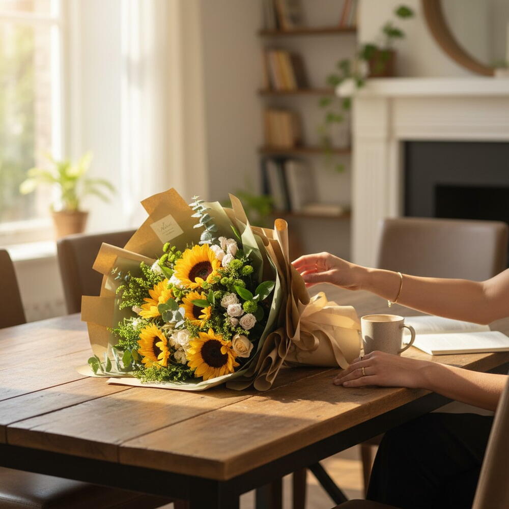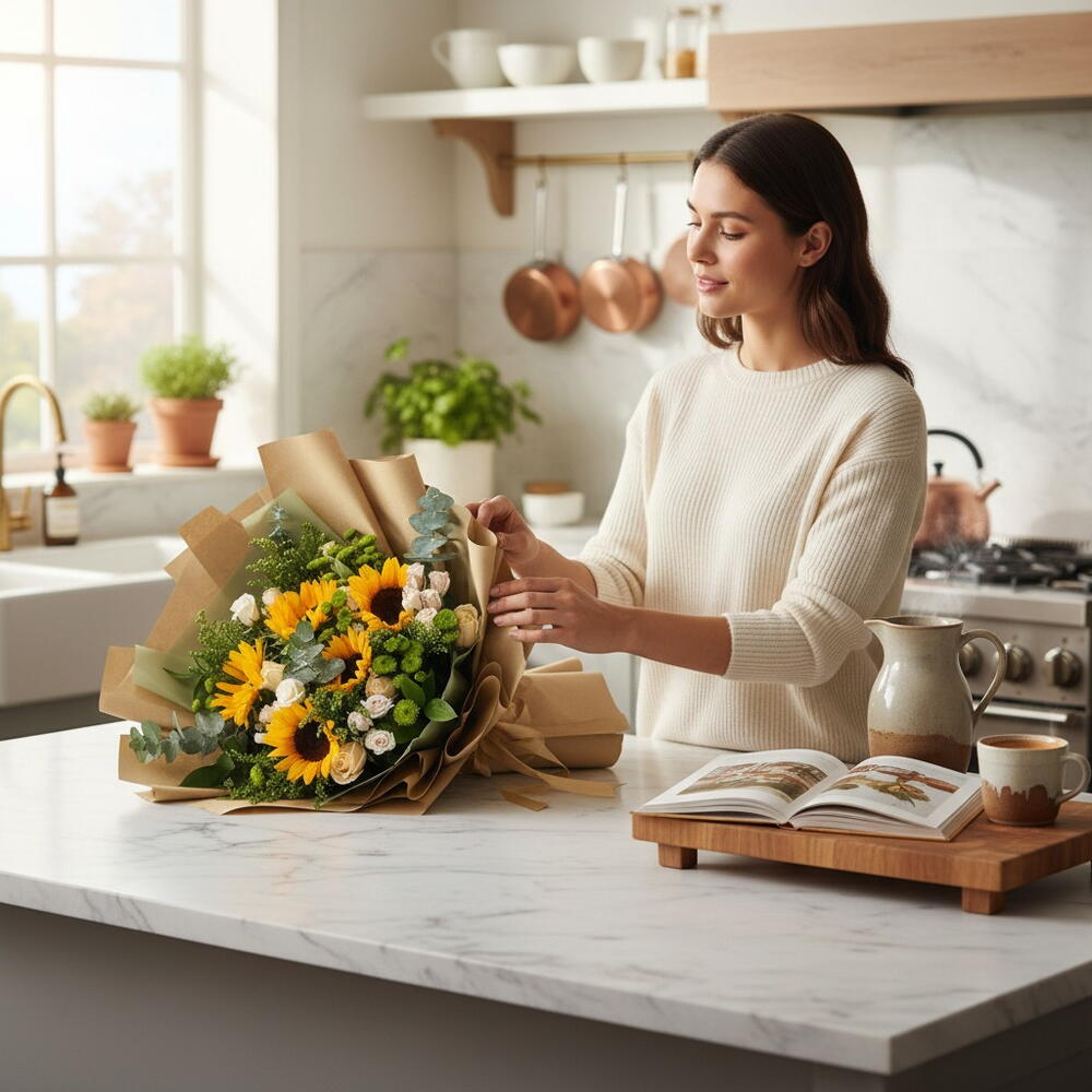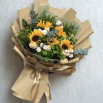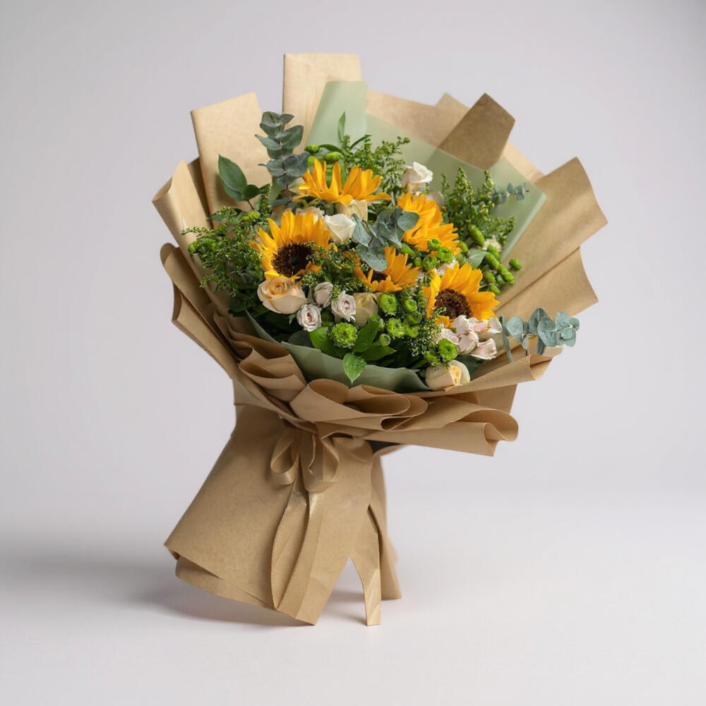 Golden Aura — роскошный букет, излучающий тепло и утончённую красоту: смелое сияние 5 подсолнухов, мягкая элегантность 5 персиковых роз, деликатное очарование 3 роз спрей розового цвета и свежая яркость 4 зелёных хризантем, искусно дополненные сезонными декоративными наполнителями. Обёрнутый в роскошную коричневую фактурную бумагу, этот премиальный букет воплощает сущность природной утончённости и идеально подходит для празднования золотых моментов и значимых связей. 30×40