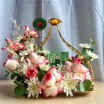 «Золотое наслаждение цветением | Розовые розы, хризантемы, шоколадные конфеты Patchi в роскошной подставке – эксклюзивный подарок на Рамадан»
