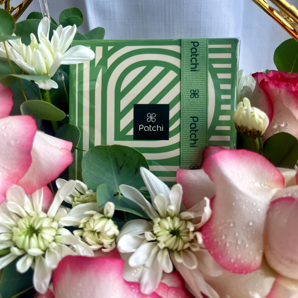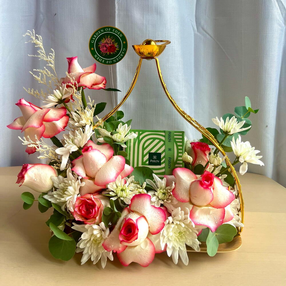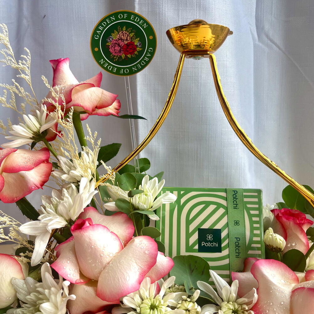 «Золотое наслаждение цветением | Розовые розы, хризантемы, шоколадные конфеты Patchi в роскошной подставке – эксклюзивный подарок на Рамадан»