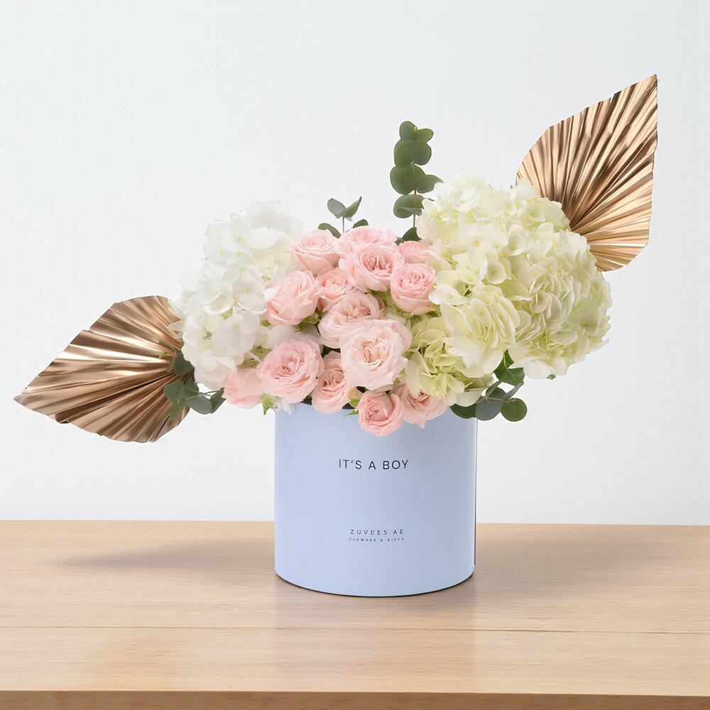 Отпразднуйте рождение драгоценного мальчика с помощью цветочной коробки Golden Grace – It’s a Boy, которая представляет собой продуманное сочетание нежных цветочных композиций и элегантных акцентов, призванных приветствовать новые начинания с любовью и радостью.