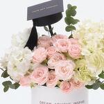 Celebrate a meaningful milestone with the Golden Hour Graduation Flower Box, a dreamy and refined arrangement that captures the soft glow of success and hope. Designed to honor achievements with grace, this bouquet blends pastel elegance with celebratory flair, making it an unforgettable graduation gift. The arrangement features 2 voluminous white hydrangeas, symbolizing gratitude and enlightenment, alongside 5 blush-toned pink bombastic spray roses — known for their romantic charm and joyful spirit. Accents of fresh eucalyptus add a natural touch, while striking gold-sprayed palm leaves and a miniature graduation cap crown the ensemble in proud celebration. Housed in a premium round white box stamped with the words “Dream. Achieve. Inspire.”, this floral display isnt just a bouquet — its a tribute to resilience, beauty, and the golden promise of what lies ahead.