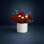 Ferrero rocher - 3 шт. red roses - 8 шт. лиственница эвкалипта - 3 шт. круглая картонная коробка для цветов - 1 шт.