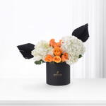 Погрузитесь в лучезарное очарование этой изысканной композиции «Цветы в коробке». Потрясающая композиция из семи пышных оранжевых роз в сочетании с двумя белоснежными гортензиями идеально сочетается с земным ароматом трёх эвкалиптовых стеблей. Эти искусно собранные цветы, изысканно подчеркнутые двумя чёрными пальмовыми листьями, создают атмосферу смелой элегантности и классической красоты, которая непременно очарует вас. Этот изысканный цветочный набор в стильной коробке подарит вам незабываемые впечатления и станет прекрасным подарком на любой случай.