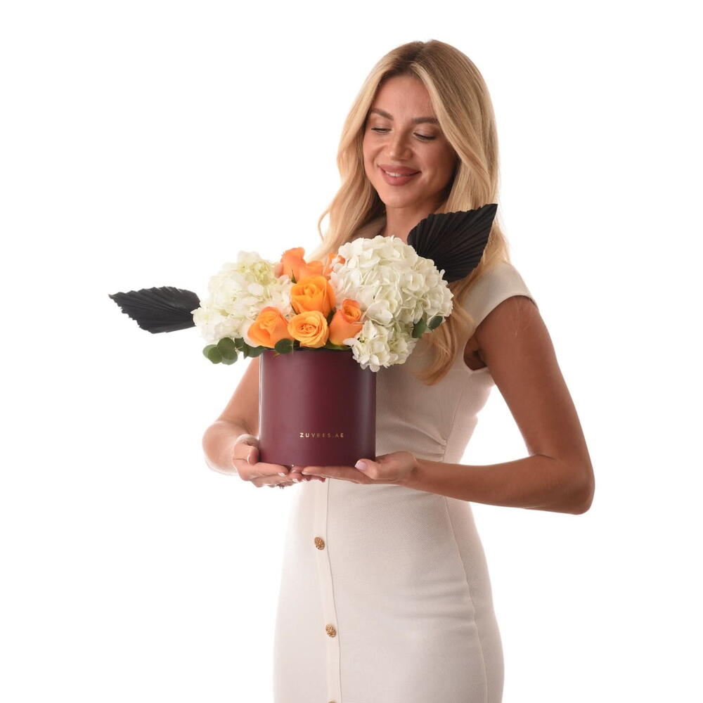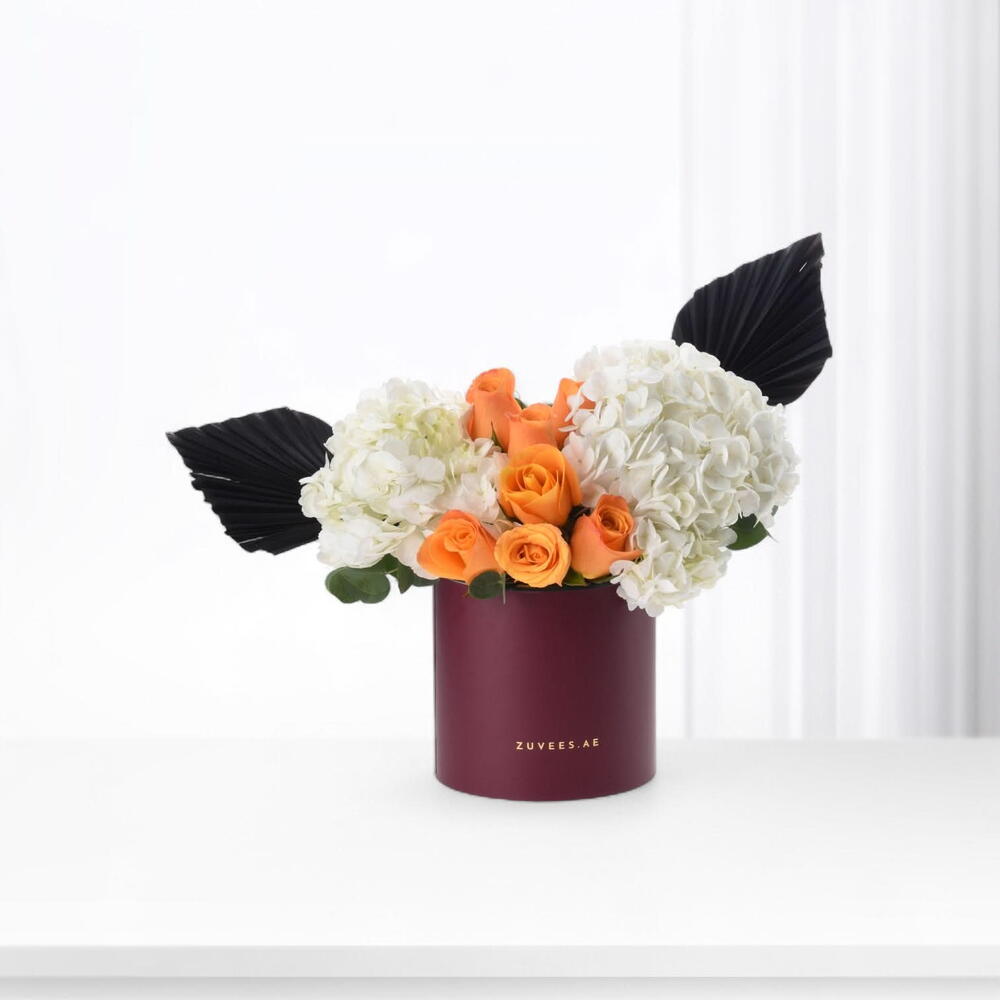 Ощутите сочетание природной изящности и утончённости с нашим великолепным вариантом «Цветы в коробке». Этот прекрасный ансамбль искусно объединяет 3 веточки душистого эвкалипта, 2 цветущие белые гортензии и 7 ярких оранжевых роз. Для добавления выразительного контраста и текстуры предусмотрены 2 скульптурно оформленных чёрных сушёных пальмовых листа. Будь то особый случай или просто желание освежить ваше пространство, эта изысканная композиция обещает впечатлить.