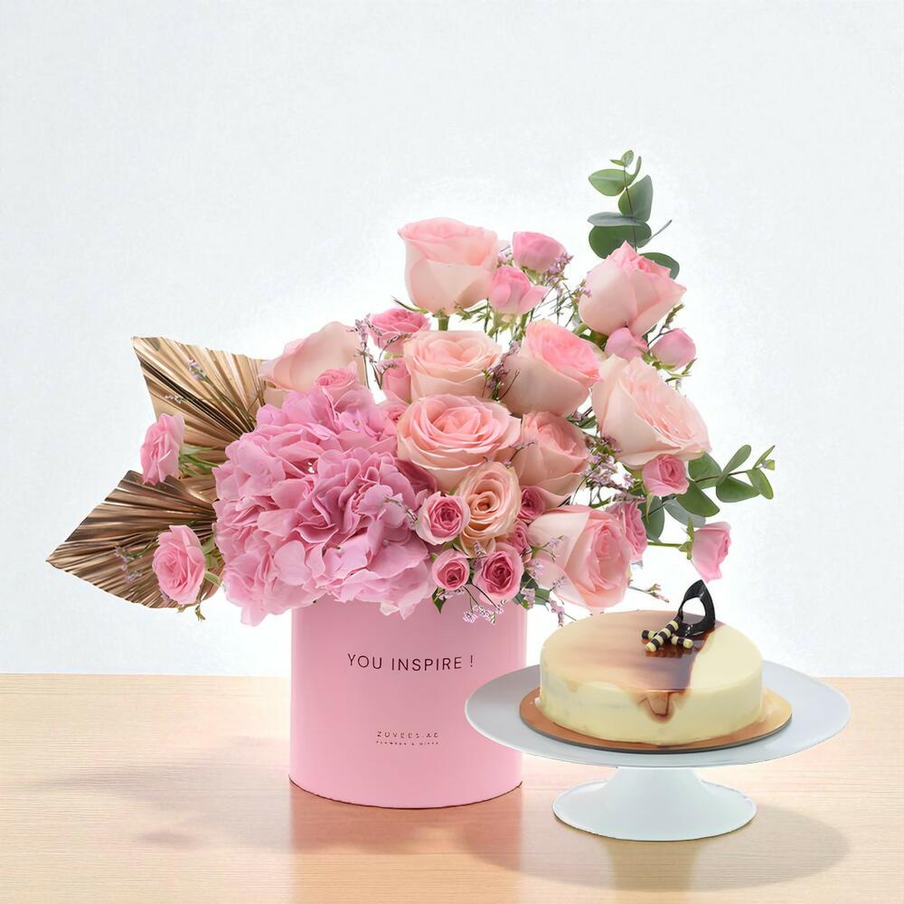 Сочетание красоты и роскоши — набор Golden Pink Inspire Bloom Box с тортом — идеальный набор для праздника. Эта изысканная композиция из роз эсперанс нежно-розового оттенка, розовой гортензии, кустовых роз и золотистых листьев дополняется премиальным тортом на ваш выбор. Выберите один из множества изысканных вкусов: «Мрамор», «Манго Кунафа», «Тройной шоколад», «Ванильный вихрь» или «Розовая помадка», — чтобы сделать ваше торжество по-настоящему личным и изысканным.