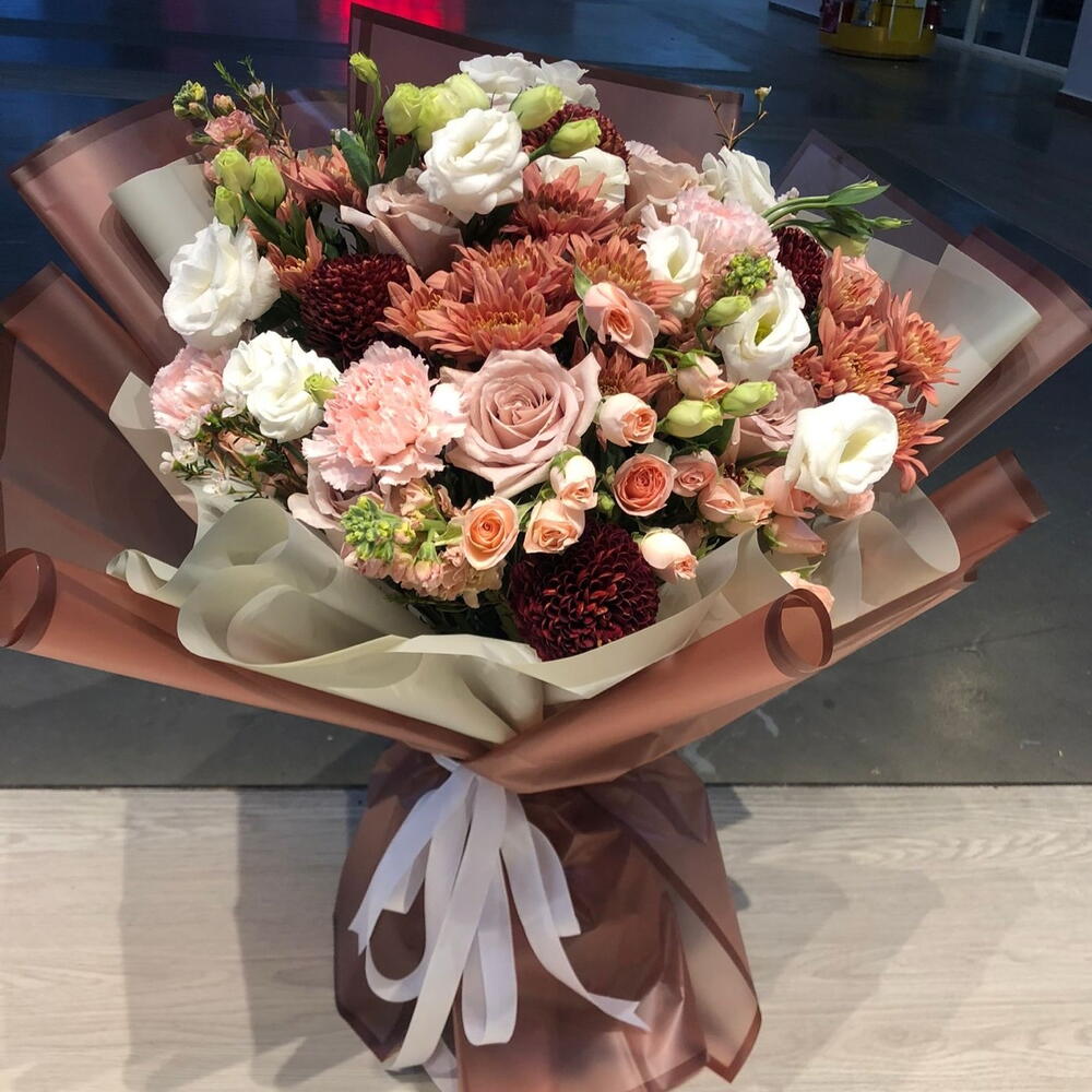 Chrysanthemum - 6 шт. Wax flower - 10 шт. rose - 10 шт. carnation - 6 шт. белая маттиола - 4 шт. пинг-понг - 6 шт.