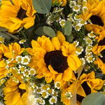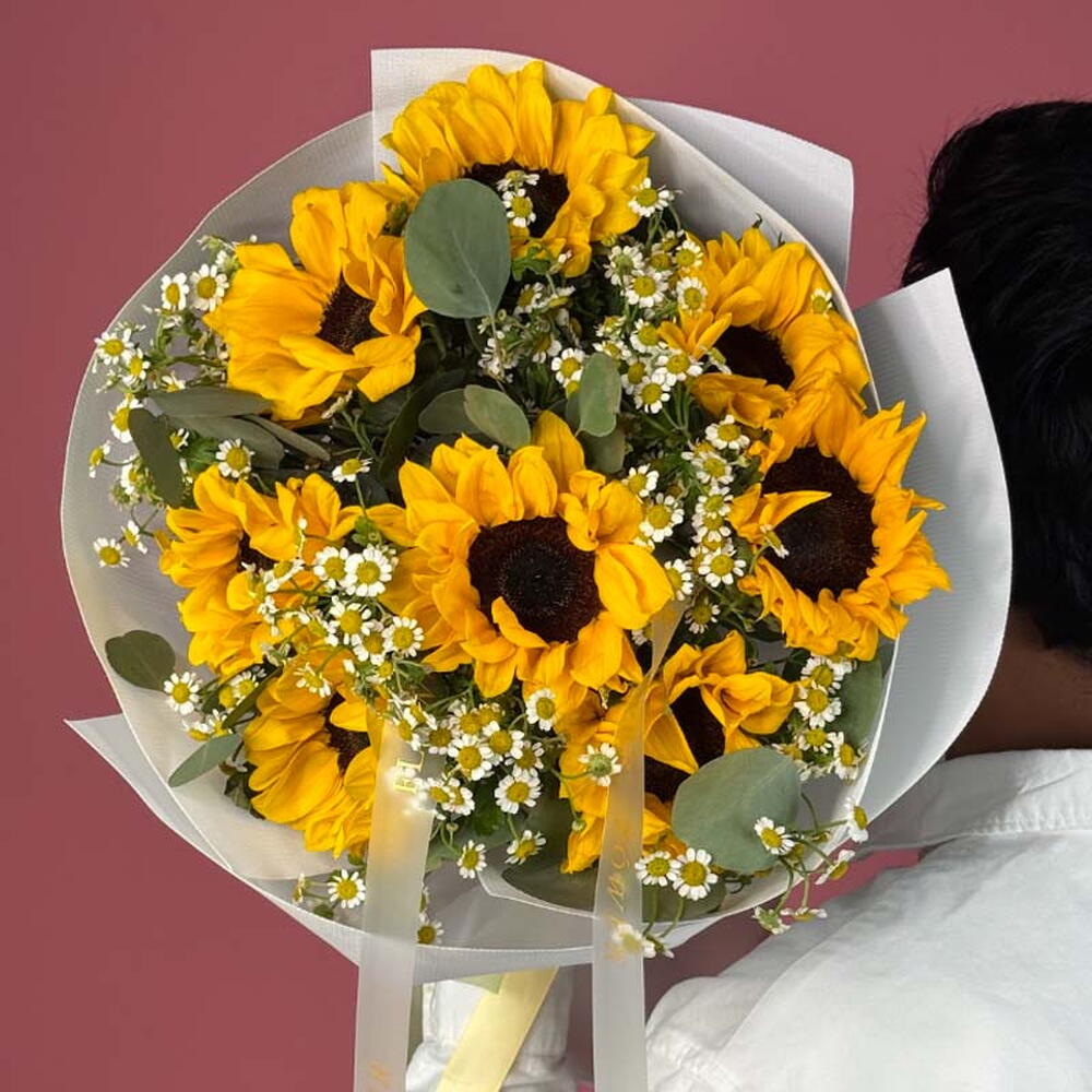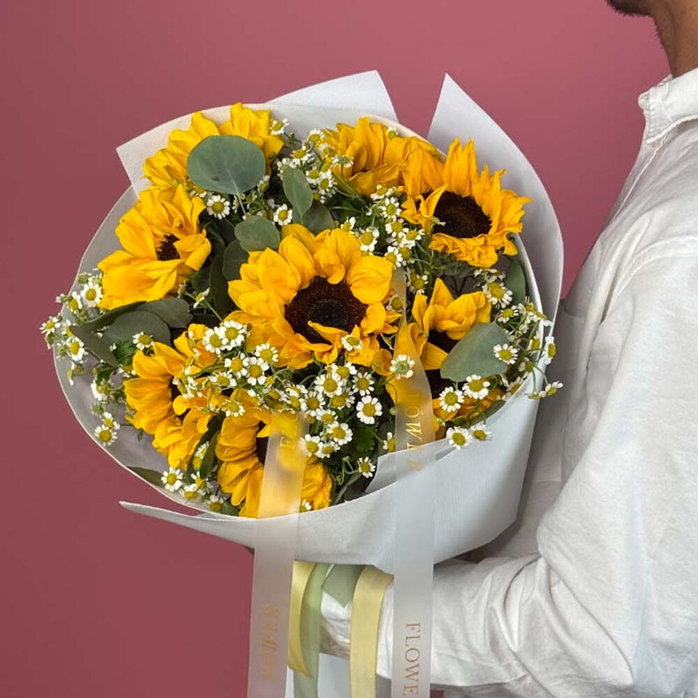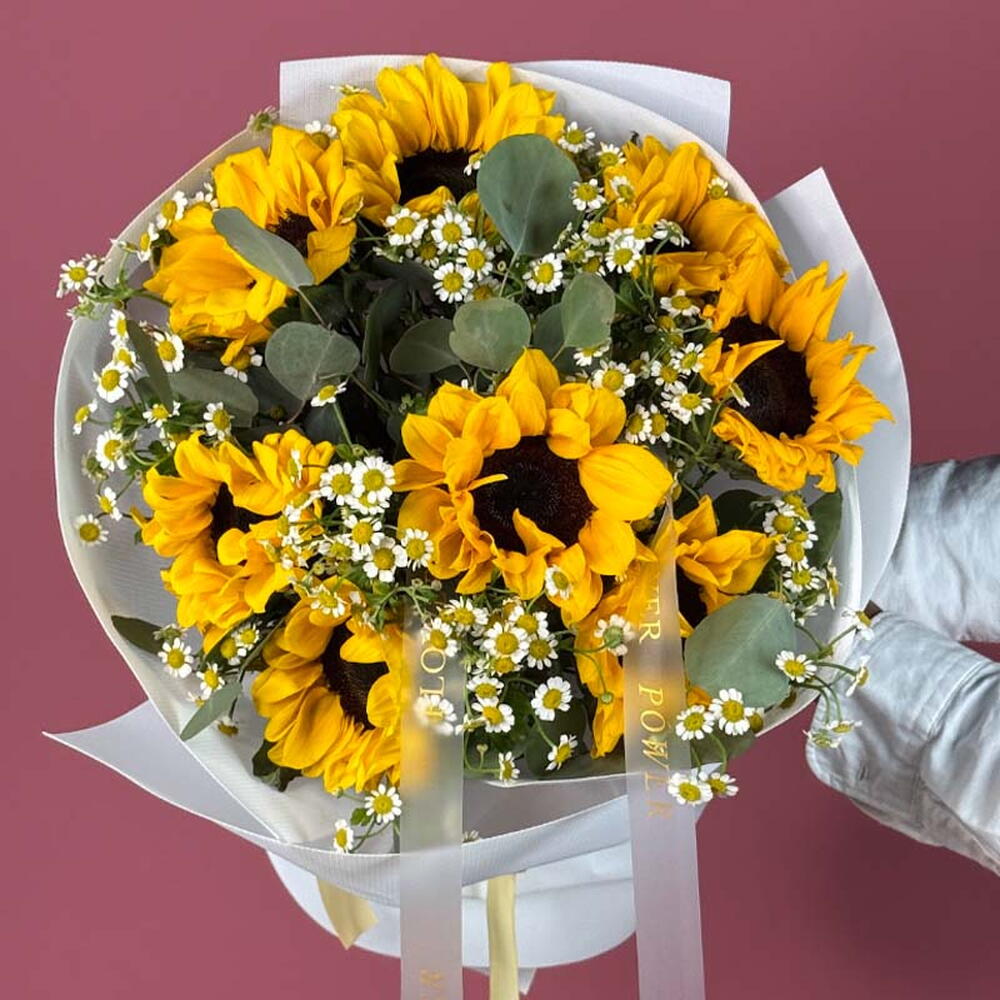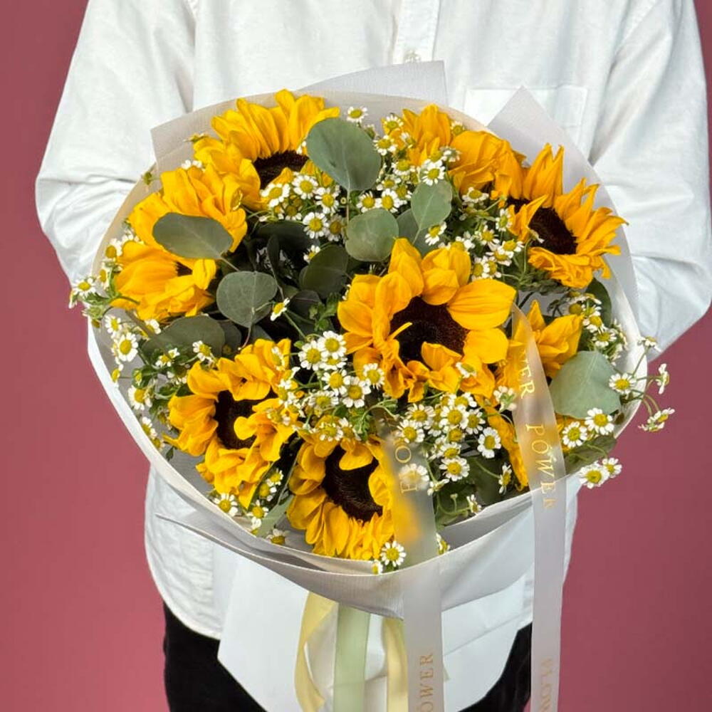 Взрыв чистой радости! Этот сияющий букет Golden Sunshine содержит 8 жизнерадостных подсолнухов, дополненных свежим ароматом 3 стеблей эвкалипта и нежным очарованием 9 танаксетум (feverfew). Простая, яркая композиция, которая гарантированно скрасит любой день.
