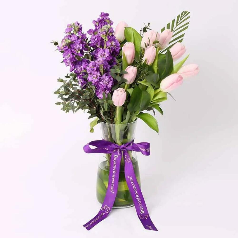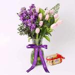 pink tulips - 10 шт. ferrero rocher chocolates - 200 гр. фиолетовая маттиола - 5 шт. стеклянная ваза и перевязан ленточным бантом - 1 шт. листья - palviforia и пальма - 1 шт.