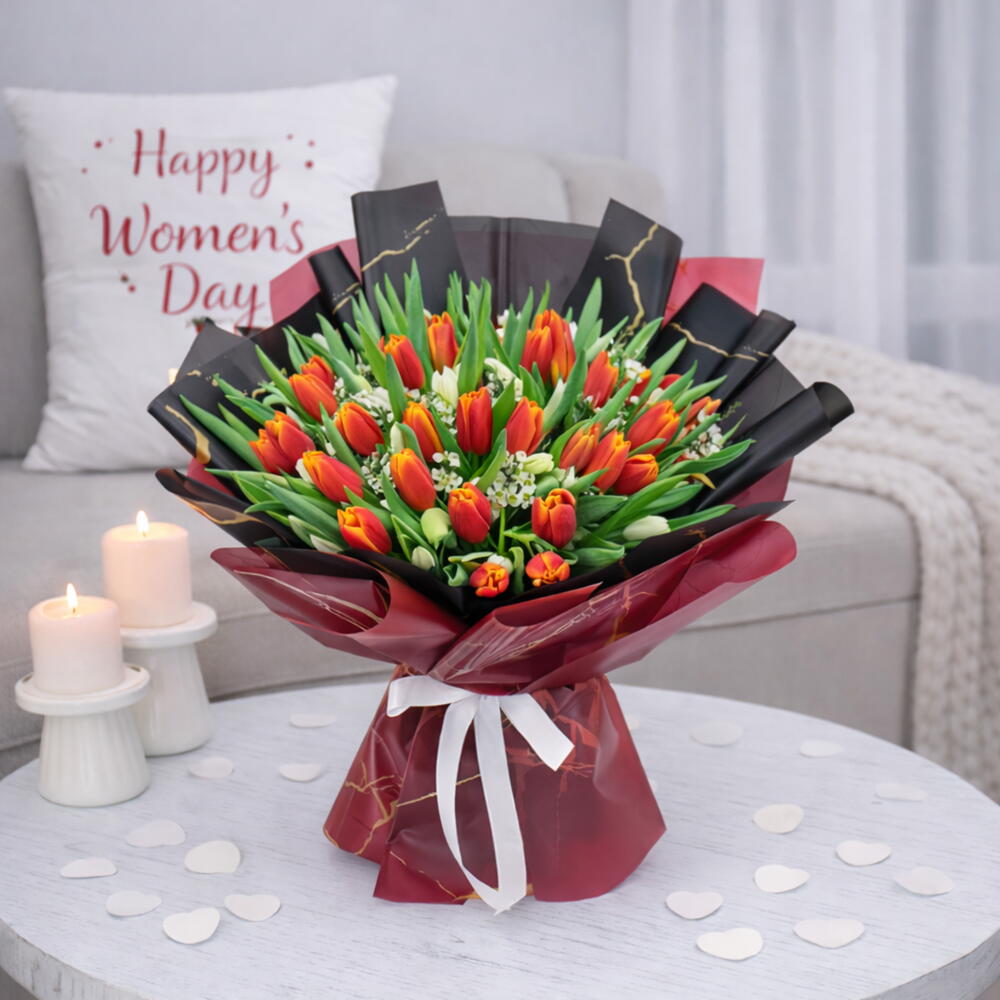 Дес - Прекрасный букет из 101 красного и белого тюльпана в черно-красной мраморной упаковке, перевязанный белой лентой с бантом.