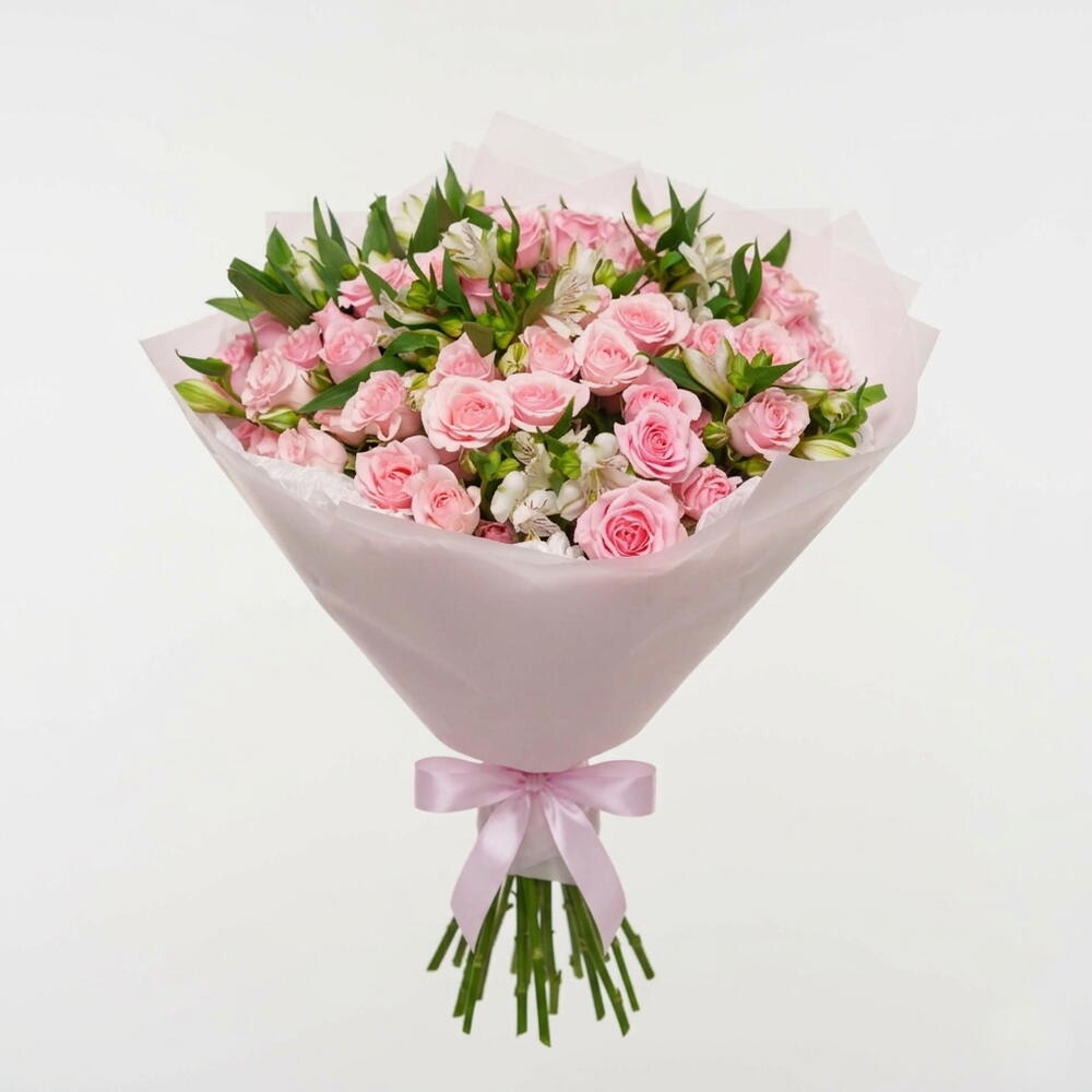 стебли розовых кустовых роз - 12 шт. белые стебли альстромерии - 12 шт.