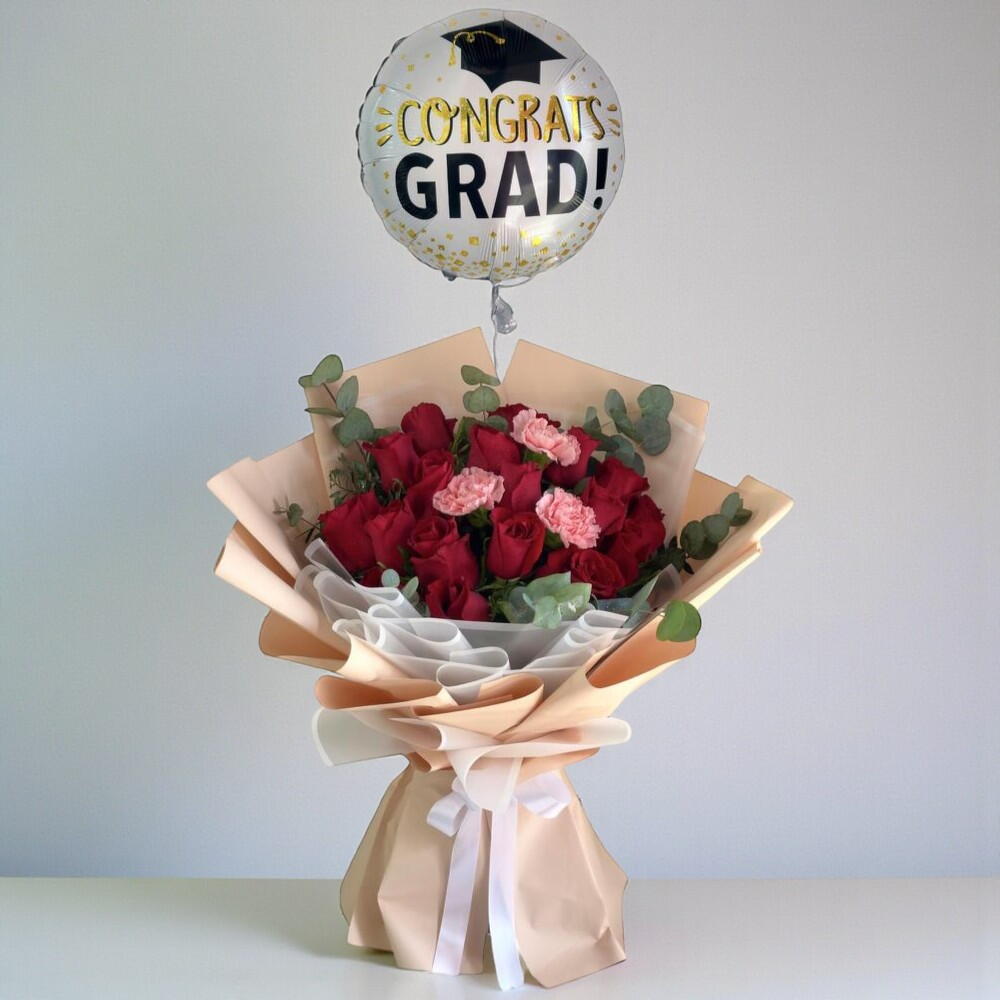 Отпразднуйте свой выпускной с этим радостным подарком, включающим в себя яркий фольгированный шар «Поздравляю с выпуском» и элегантный букет из 18 красных роз и 3 розовых гвоздик. «Сияние выпускника», тщательно упакованное и наполненное искренним теплом, — идеальный способ сказать: «Ты справился!» — стильно, изящно и с гордостью.