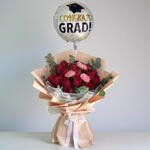 Red rose - 18 шт. Ribbon - 1 шт. Eucalyptus - 7 шт. Wrapping - 6 шт. pink carnation - 3 шт. фольгированный шар congrats grad - 1 шт.