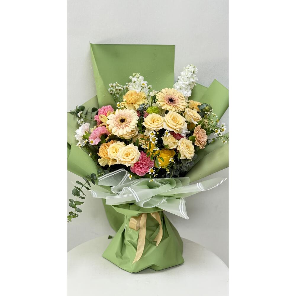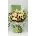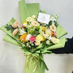 Yellow rose - 4 шт. carnation pink - 4 шт. mathiola - 2 шт. детское розовое поле - 4 шт. презентация герберы - 2 шт. презентация гвоздик - 7 шт.