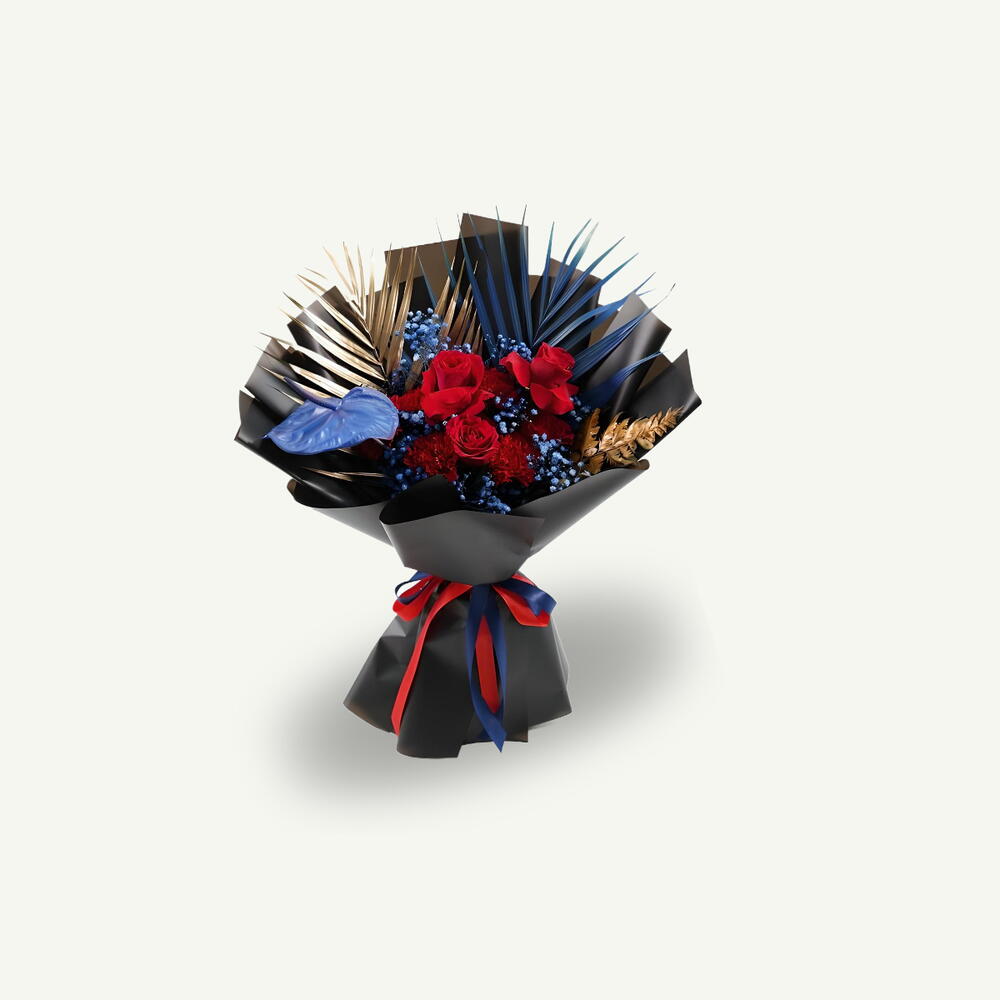 Букет в ручной связке со смесью из 3–5 свежих красных роз, 5 гвоздик, пышной зелени и 1 эффектного синего антуриума, аккуратно оформленный в стильную чёрную упаковку для смелого и элегантного завершения.