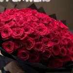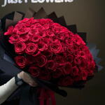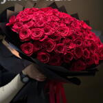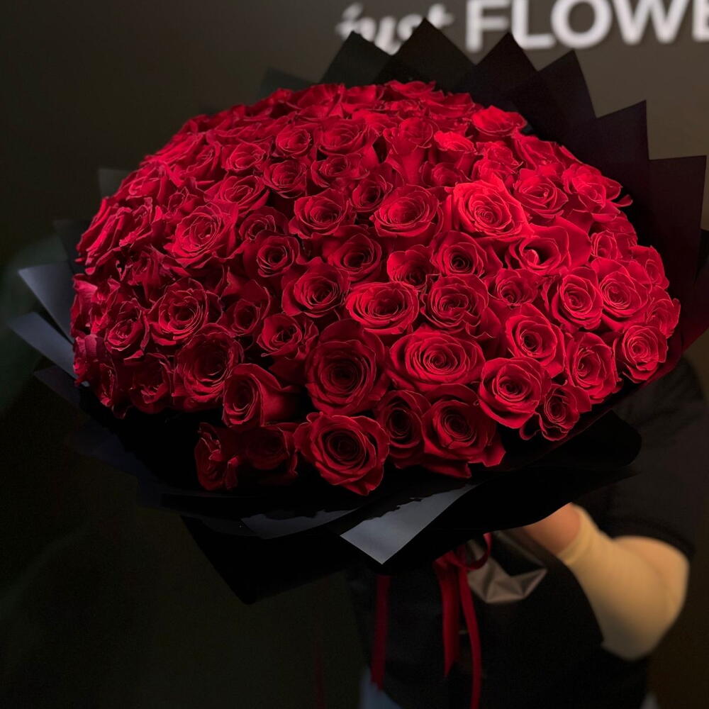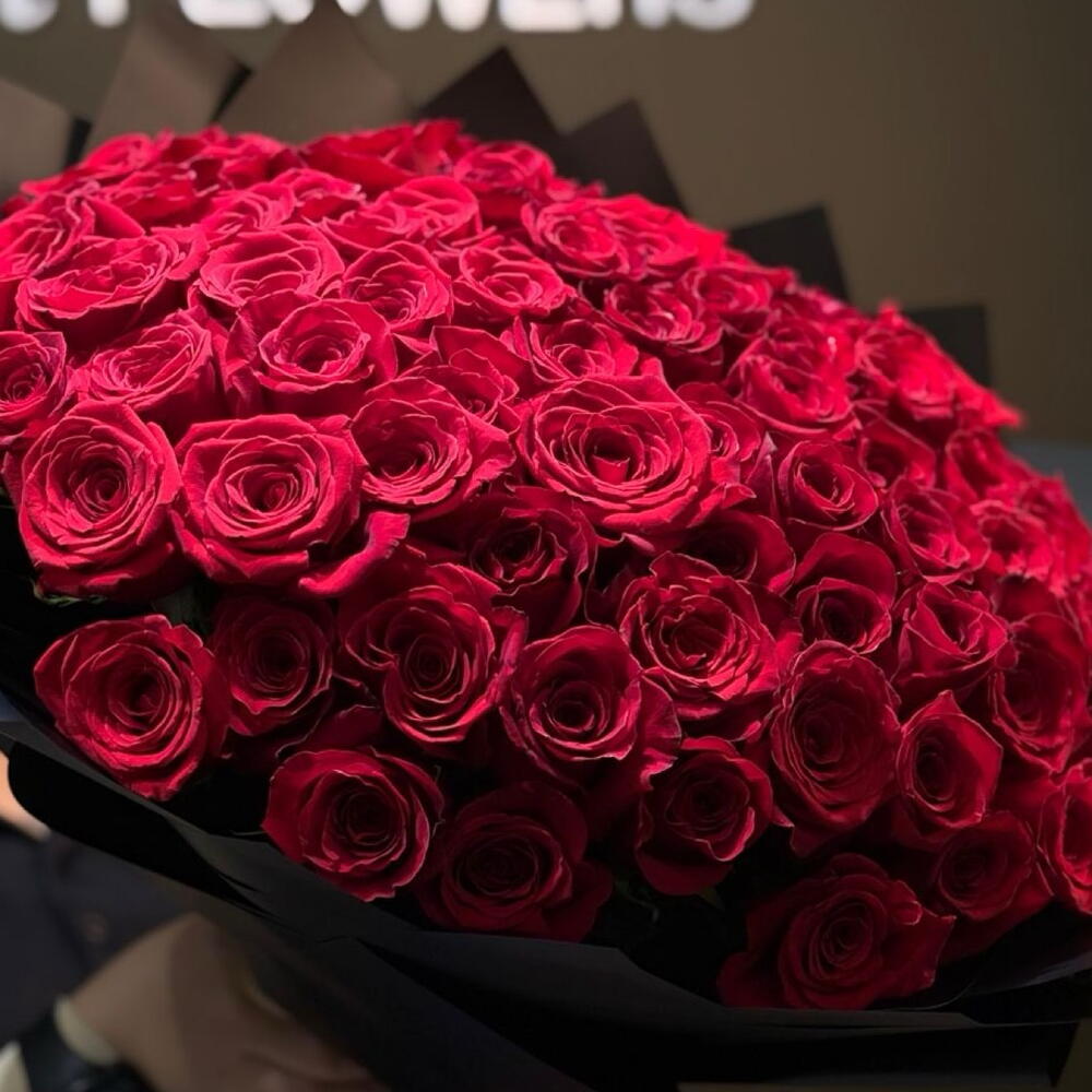 Роскошная композиция ручной работы из 100 отборных бархатисто-красных роз, красиво упакованных в элегантную чёрную матовую бумагу и украшенных богатой атласной лентой. Этот большой букет, созданный для того, чтобы выразить самую сильную любовь, страсть и восхищение, идеально подходит для годовщин, предложений руки и сердца, празднования важных дат или любого другого момента, заслуживающего захватывающего жеста. Настоящий шедевр, который говорит громче слов.