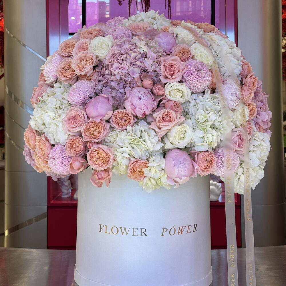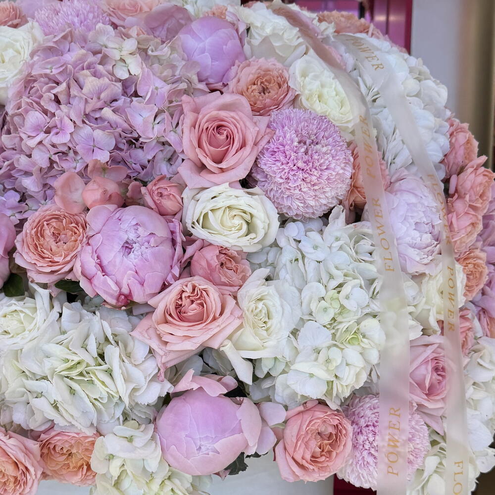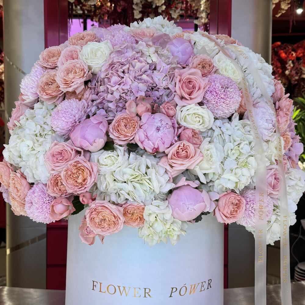 Grande Amour — высшее выражение любви — очень большая шляпная коробка, переполненная премиальными пионами, садовыми розами, гортензиями, хризантемами и спрей-розами в нежно-розовых, румяных и оттенках слоновой кости. Эта роскошная композиция идеально подходит для грандиозных романтических жестов, свадебных подарков и VIP-мероприятий. Идеальный выбор для тех, кто ищет роскошную цветочную коробку в Дубае или премиальную доставку цветов по ОАЭ. Доступна экспресс-доставка в тот же день в Дубае.