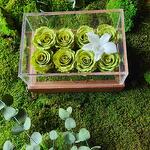 Moss - 1 шт. white orchid - 1 шт. деревянная квадратная коробка - 1 шт. зеленая вечная роза - 8 шт.