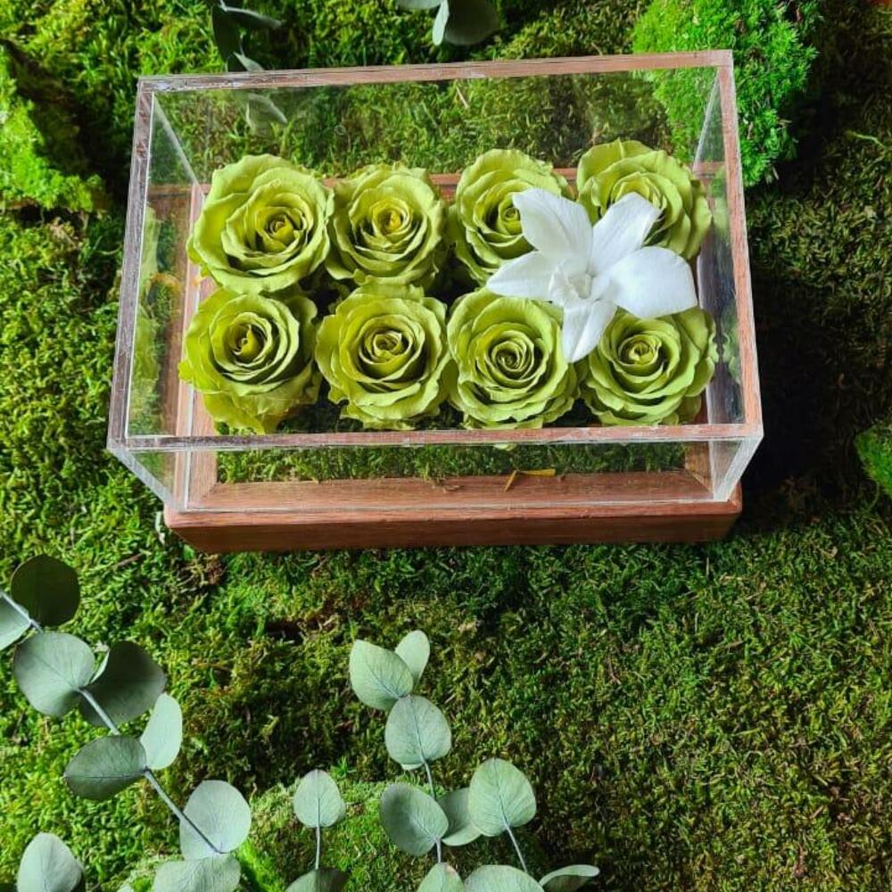 Moss - 1 шт. white orchid - 1 шт. деревянная квадратная коробка - 1 шт. зеленая вечная роза - 8 шт.