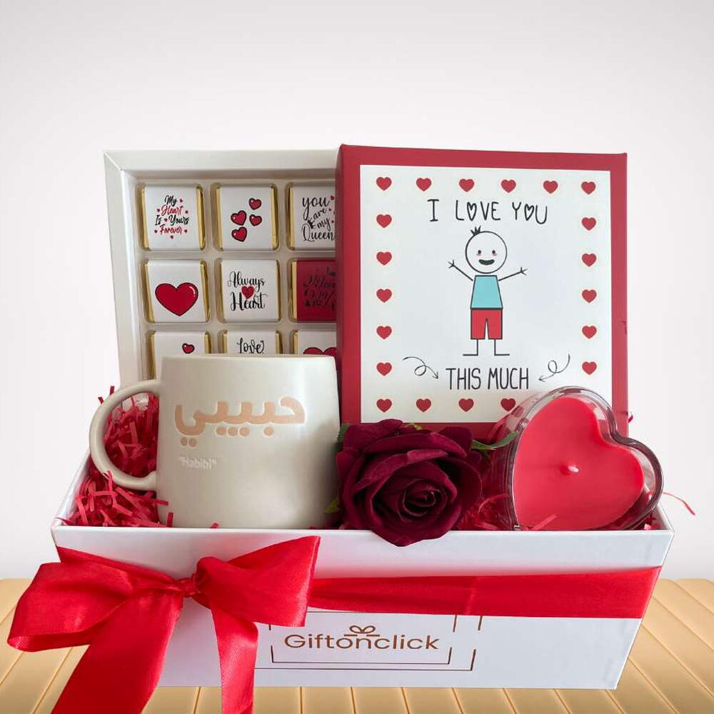 коробка шоколадных конфет, включающая 9 кусочков шоколада разных вкусов - 1 шт. "habibi" фарфоровая кружка - 1 шт. красная свеча в стеклянной форме сердца - 1 шт.
