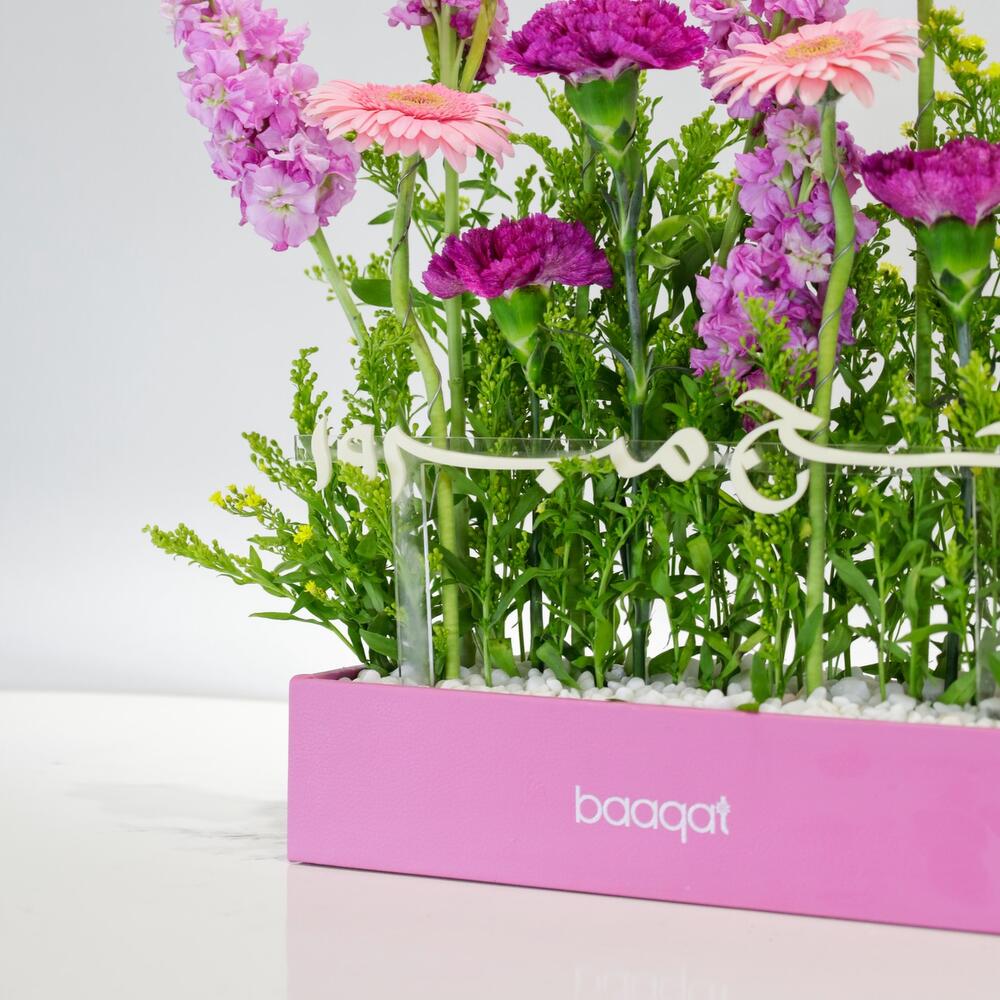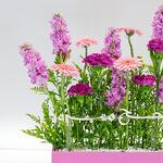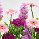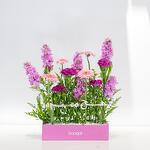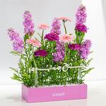 Ощутите восхитительное буйство красок с этой изысканной композицией. Эта искусная композиция состоит из четырёх ярко-розовых гермини, четырёх королевских фиолетовых гвоздик, переплетённых с шестью пышными розовыми матиолами. Мягкие изгибы шести жёлтых солидаго дополняют яркую композицию. Композиция дополнена одним красивым акриловым топпером в стиле хадж, что делает её ещё более особенной. Это идеальный подарок или эффектное украшение в любом интерьере. Посмотрите, как гармонично эти цветы сочетаются друг с другом, создавая визуальное наслаждение для ваших особых моментов.