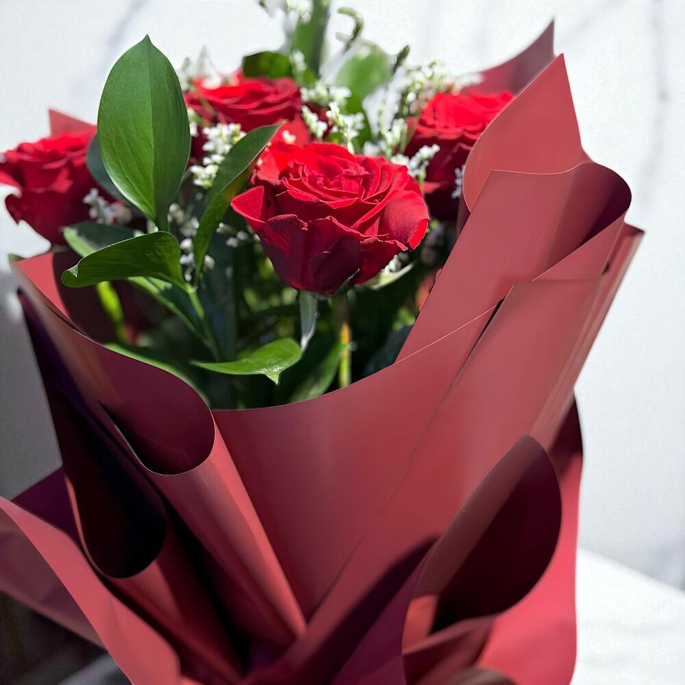 Завёрнутый в насыщенную красную бумагу, подчёркивающую глубокий оттенок цветов, этот букет идеально подходит для романтических жестов, годовщин и особых праздников.
