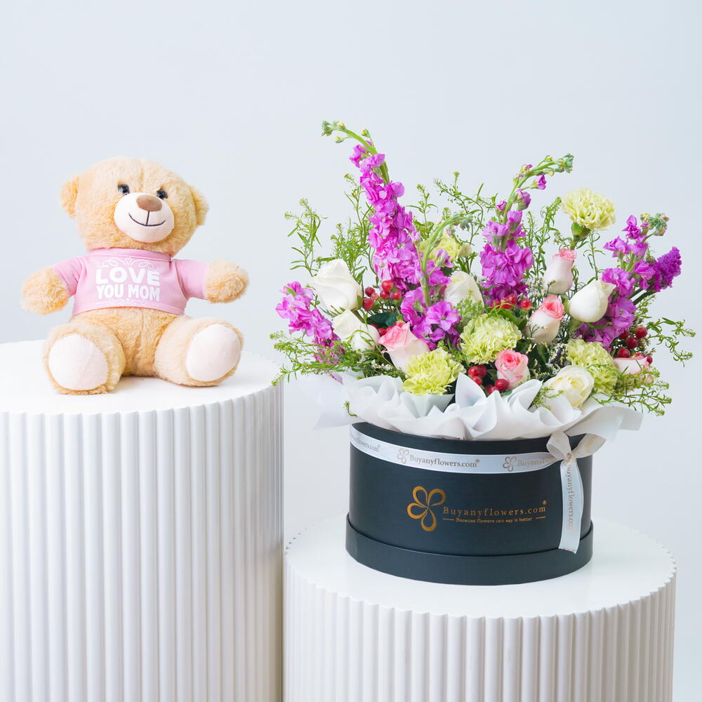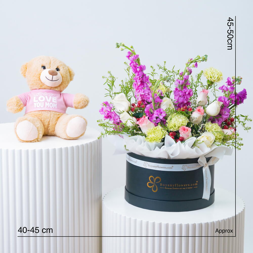 red hypericum - 4 шт. green carnations - 5 шт. розовая маттиола - 5 шт. white roses - 5 шт. розы джумилия - 5 шт. стебли белого лимониума - 2 шт. стебли лепидиума - 2 шт. завязано белой лентой - 1 шт. плюшевый мишка 25 см «люблю тебя, мама» - 1 шт. оформлено в черной средней коробке (25 × 15 см) - 1 шт.