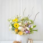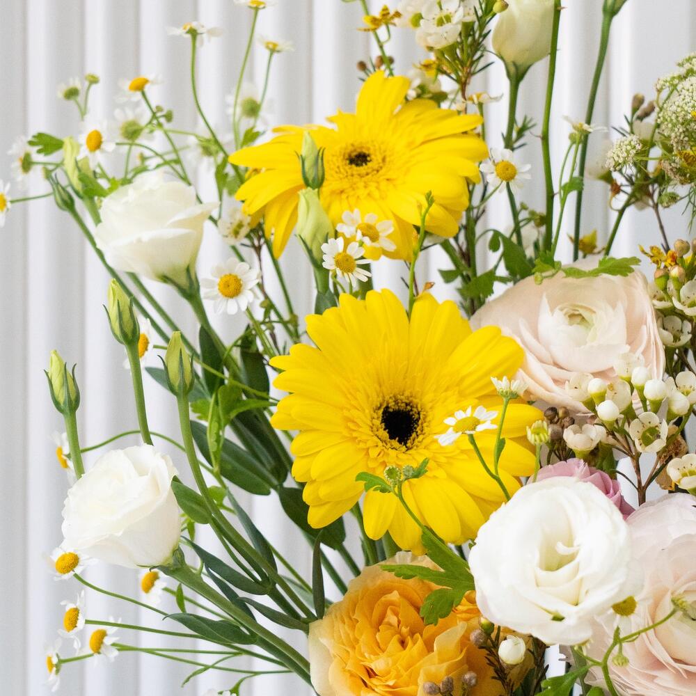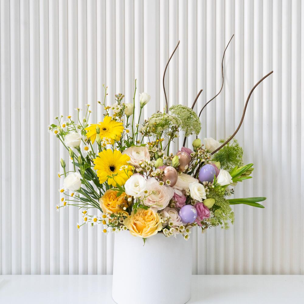 Gerbera - 2 шт. Wax flower - 3 шт. Hyacinth - 3 шт. ranunculus - 4 шт. daisy - 2 шт. garden rose - 2 шт. стома - 4 шт.