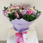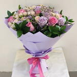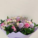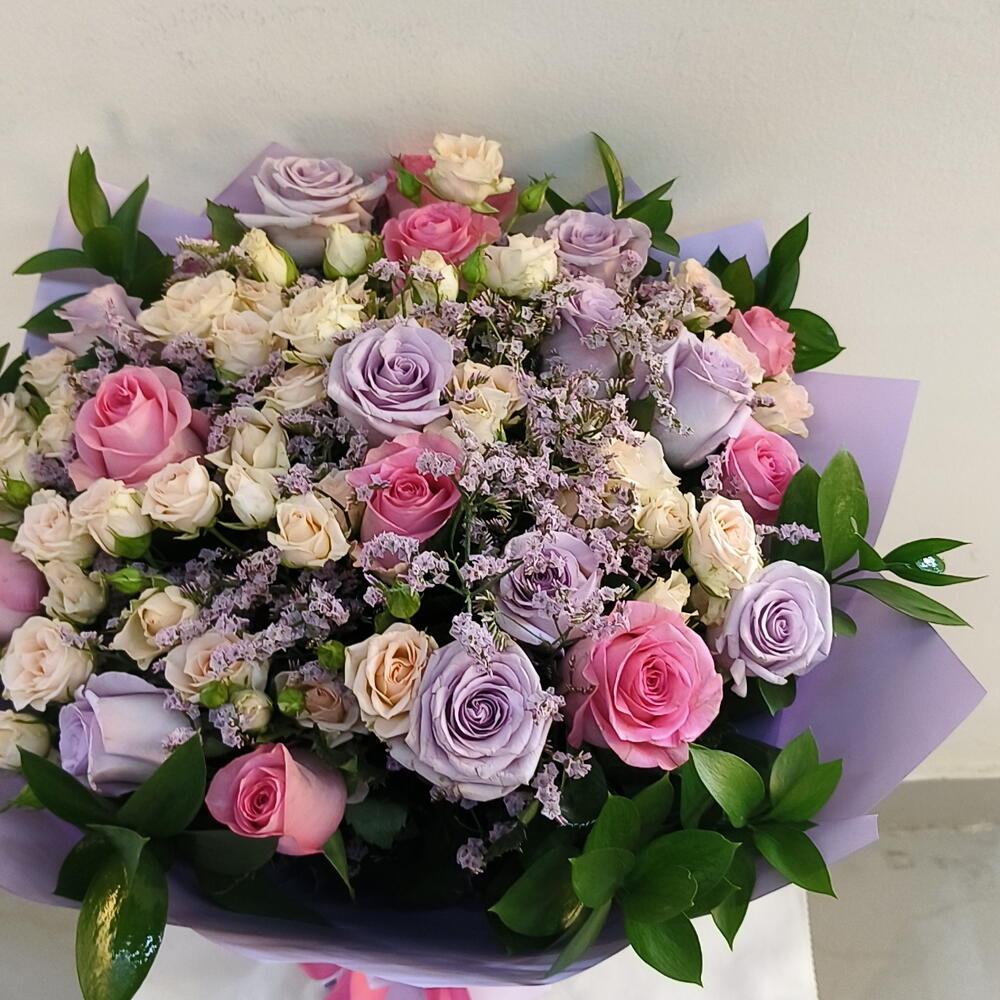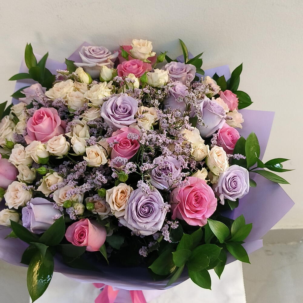 Ruscus - 7 шт. Limonium - 4 шт. Pink rose 50 cm - 8 шт. purple rose - 8 шт. стебли белых мини-роз - 4 шт.
