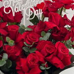 Потрясающий букет ярко-красных роз, оформленный в изящном чёрном контейнере с чёрной лентой. Композиция предназначена ко Дню святого Валентина и украшена белой надписью Happy Valentines Day