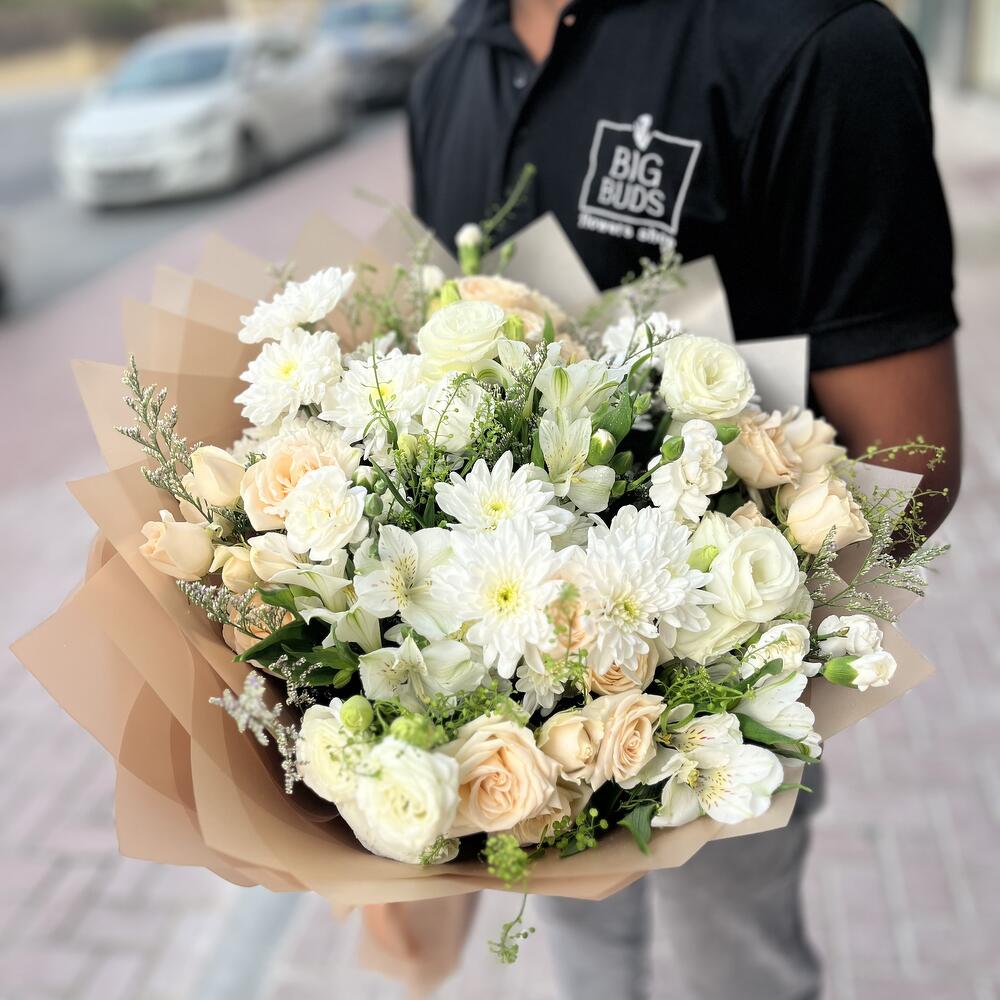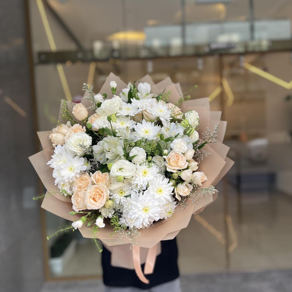 spray carnations - 3 шт. white chrysanthemum - 3 шт. lisianthus white - 3 шт. персиковая мини-роза - 4 шт. альстромерия - 3 шт.