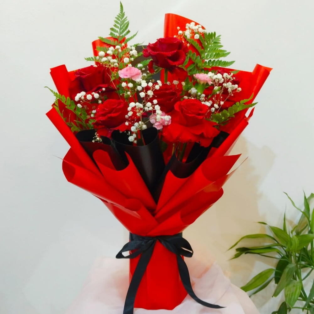 Red rose - 5 шт. gypsophila white - 5 шт. кожистый папоротник - 5 шт. мини-гвоздика - 3 шт.