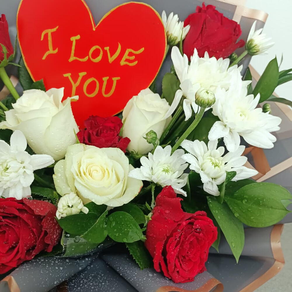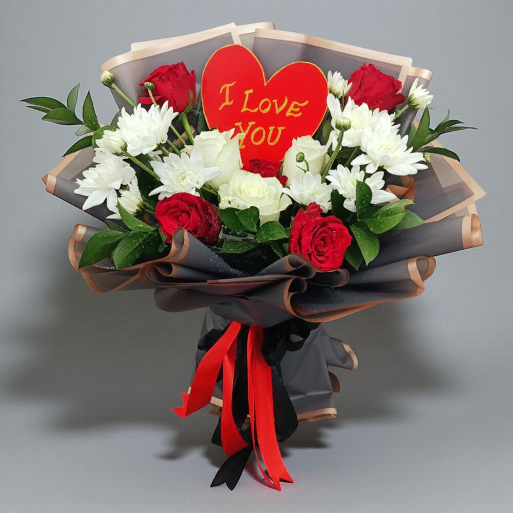 Этот романтичный букет сочетает классический контраст насыщенных красных и чистых белых роз, перемежающихся жизнерадостными белыми хризантемами и пышной зелёной листвой. В его центре расположен смелый красный топпер в форме сердца с надписью «Я люблю тебя», выполненной изящным золотым шрифтом. Букет завернут в изысканную угольно-серую бумагу с отделкой цвета розового золота и оформлен эффектным двойным бантом из красных и чёрных лент.
