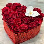 красные розы 24 в коробке‑сердце среднего размера 350 aed